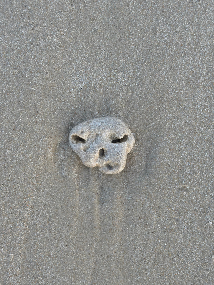 A light gray, irregularly shaped stone, approximately 8-10 cm across its widest point, is partially embedded in fine-grained, damp, light beige sand. The stone features three naturally eroded cavities…read more
