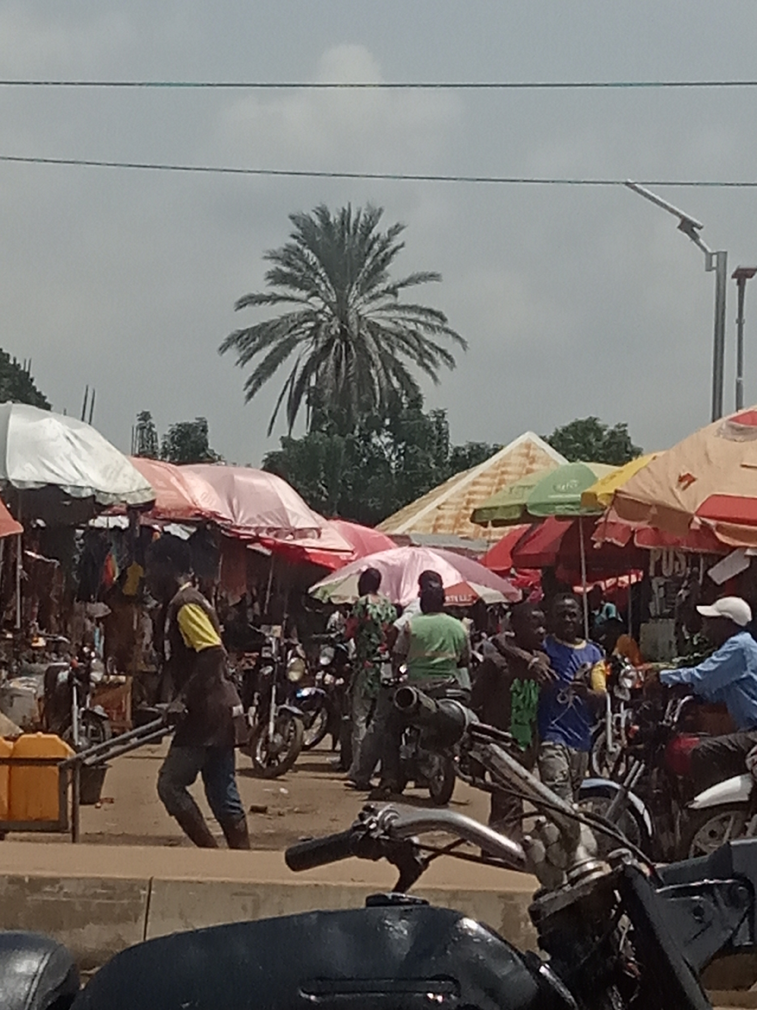 This image captures a vibrant and busy outdoor market scene in Akwanga, Nigeria, under an overcast sky. The setting is a bustling street or market square, characterized by a multitude of people, motor…read more