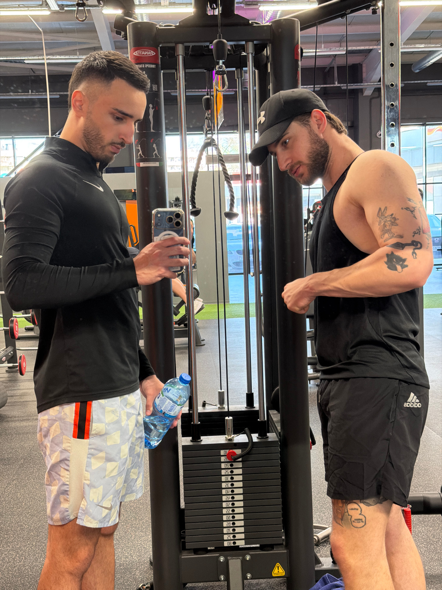 The image shows a mirrored view of two men in a gym. The first man, reflected in the top half of the image, is performing dips on a weight-assisted dip machine. He has tattoos on his right arm and leg…read more
