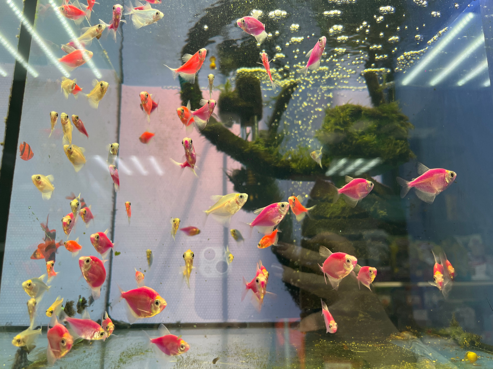The image depicts a fish tank containing various brightly colored fish, mostly GloFish tetra. The fish are pink, orange, yellow, and white. Bubbles rise in the water. A green moss-covered branch or de…read more