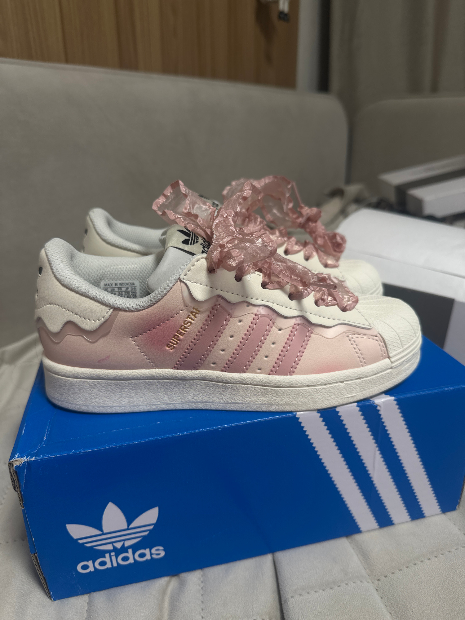The image shows a pair of pink and white Adidas Superstar sneakers with ruffled, pink laces resting on top of a blue Adidas shoebox. The shoebox is placed on a light-colored, textured surface, possibl…read more
