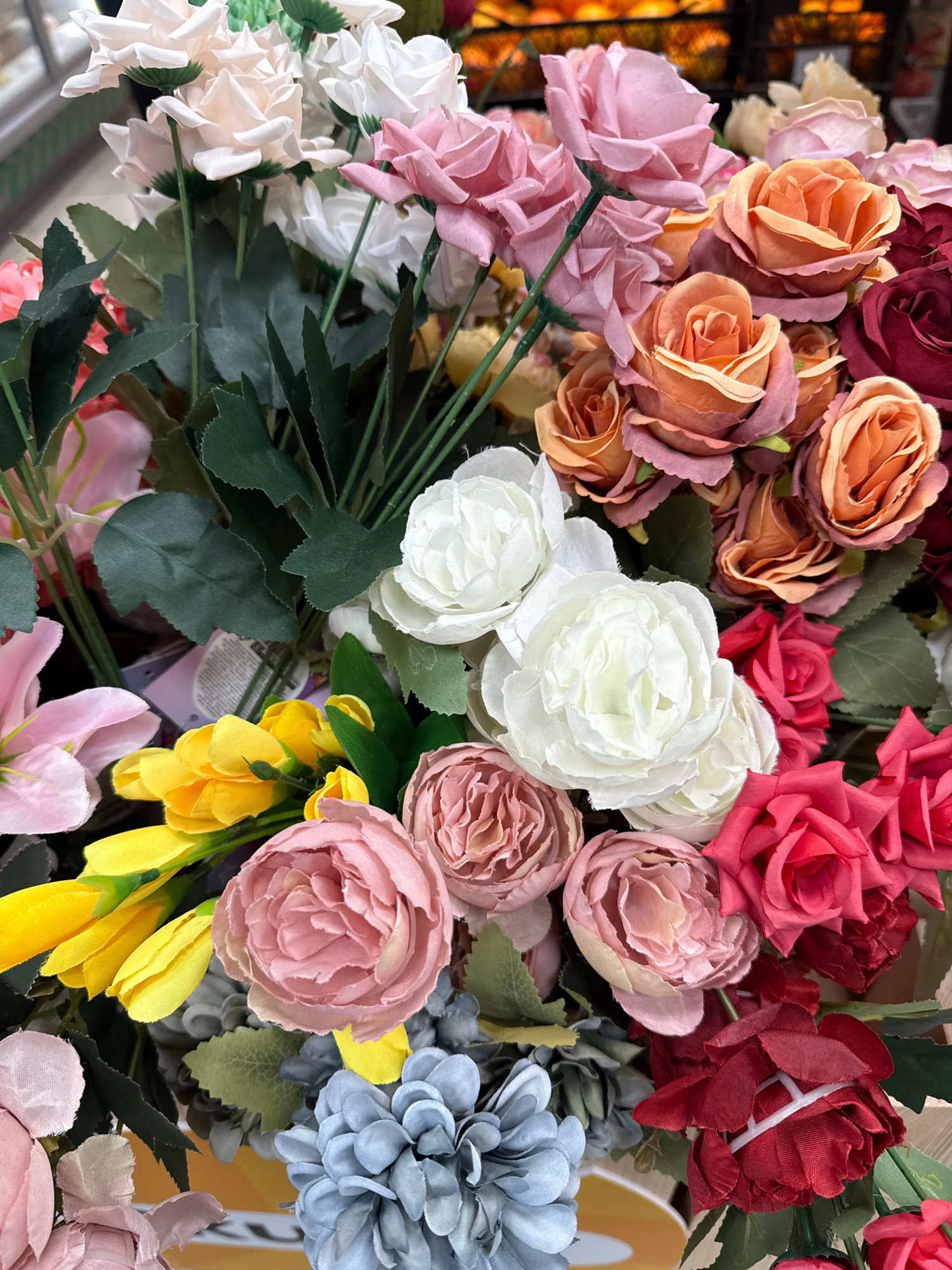 The image shows a close-up view of a bouquet of artificial flowers. The bouquet contains various colors and types of flowers, including roses (red, pink, white, peach), blue hydrangeas, and yellow tul…read more