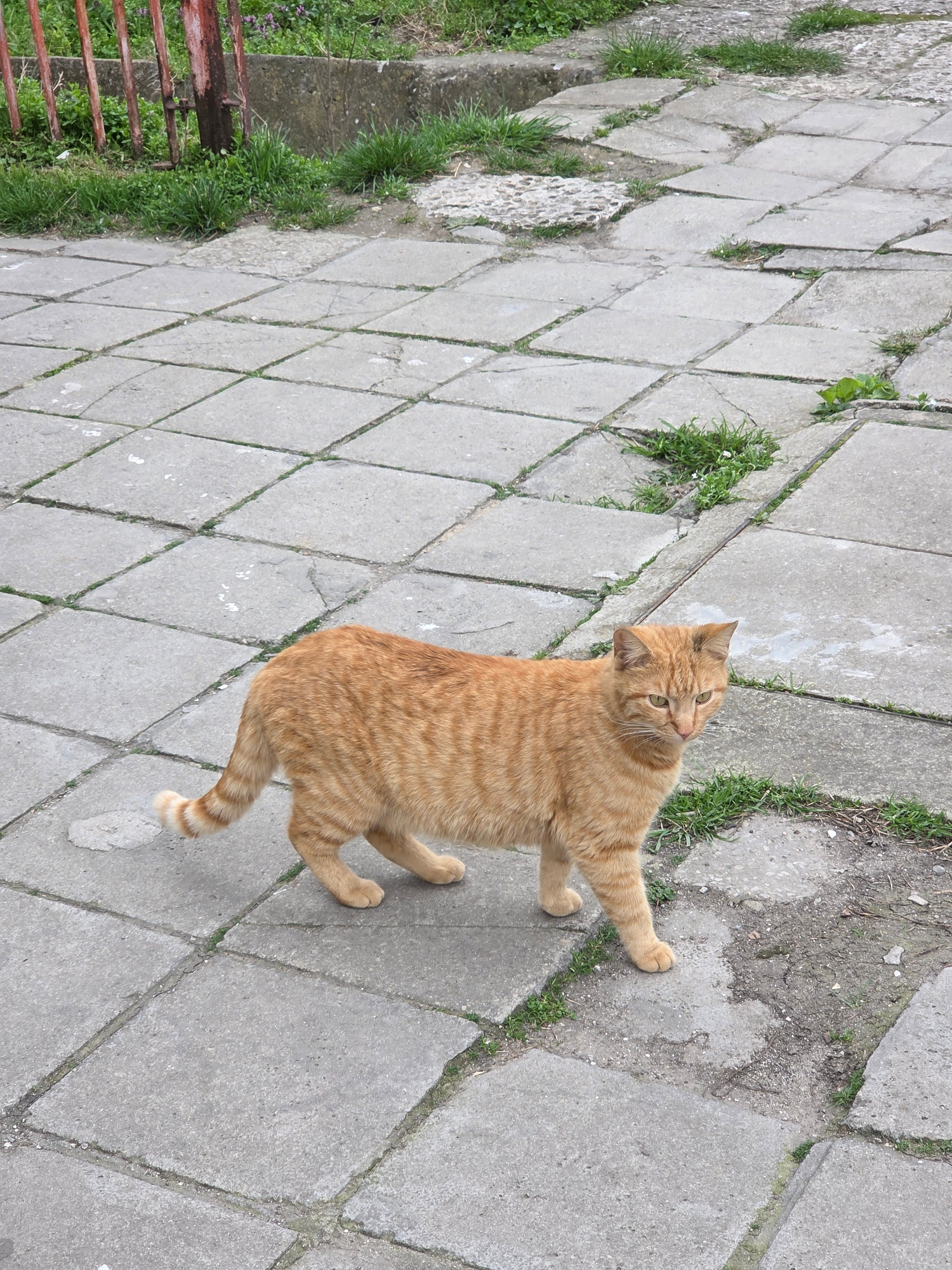 An orange tabby cat stands on a grey, stone-tiled walkway or patio. The tiles are irregularly shaped, and grass grows in the cracks between them. A rusty metal fence is visible on the left edge of the…read more