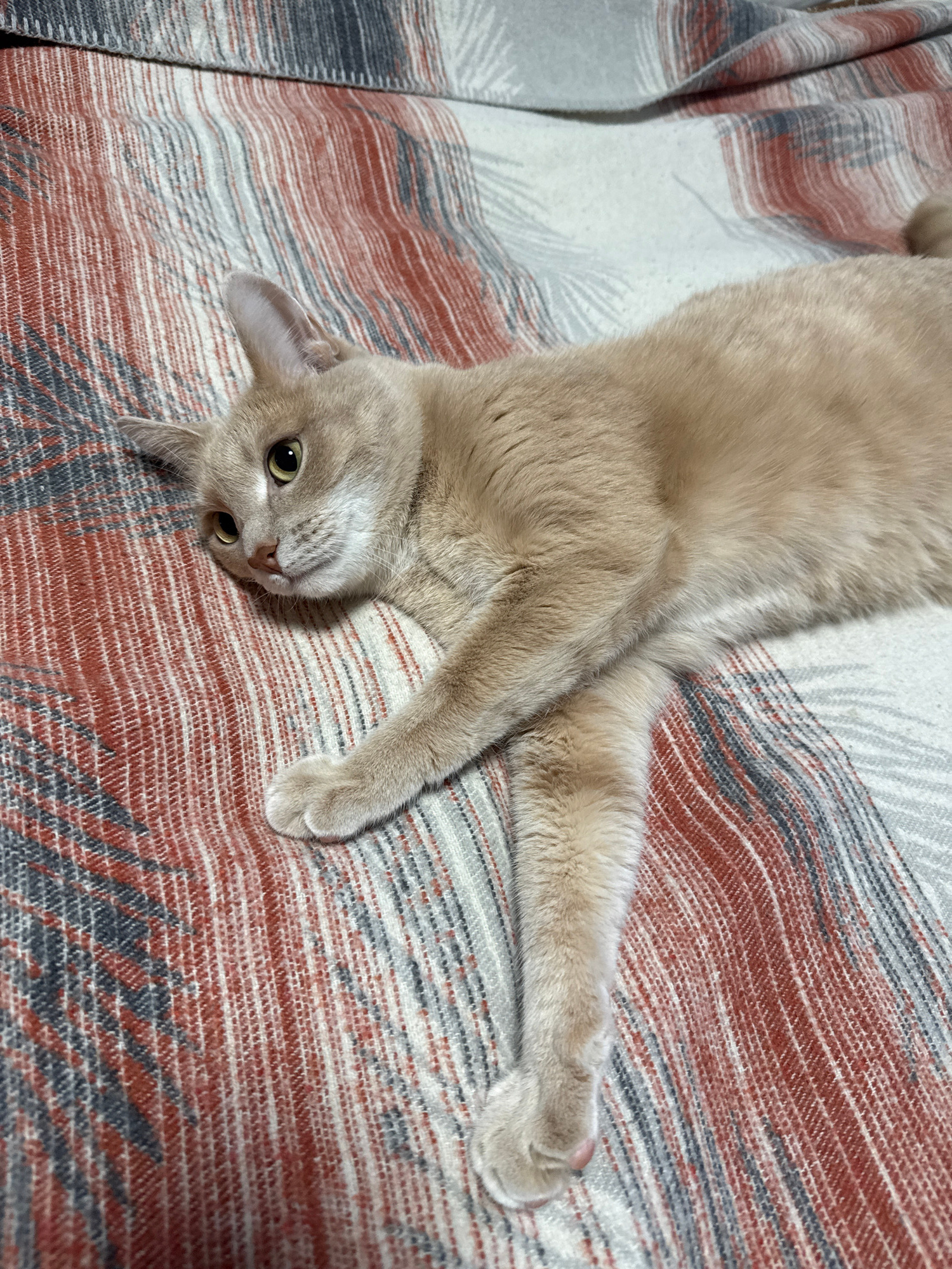 A light-brown cat is lying on its back on a patterned blanket. The blanket has alternating stripes of white, gray, and rust-colored fabric with a decorative pattern. The cat's body is stretched out wi…read more