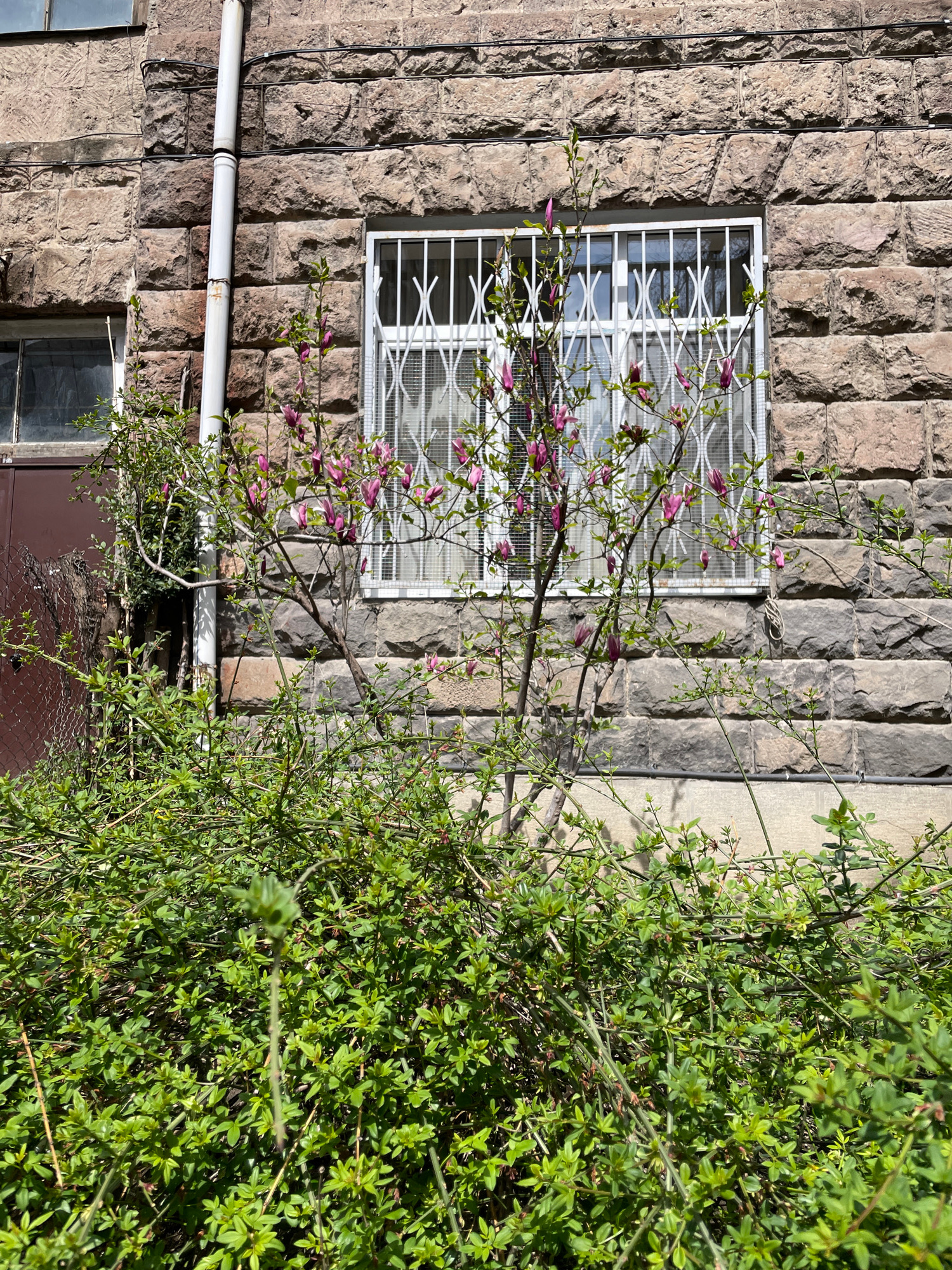 The image depicts a building in Tbilisi, Georgia, characterized by a rough-hewn stone facade. A white-framed window with a decorative grill is prominently centered on the wall. A magnolia tree, with e…read more