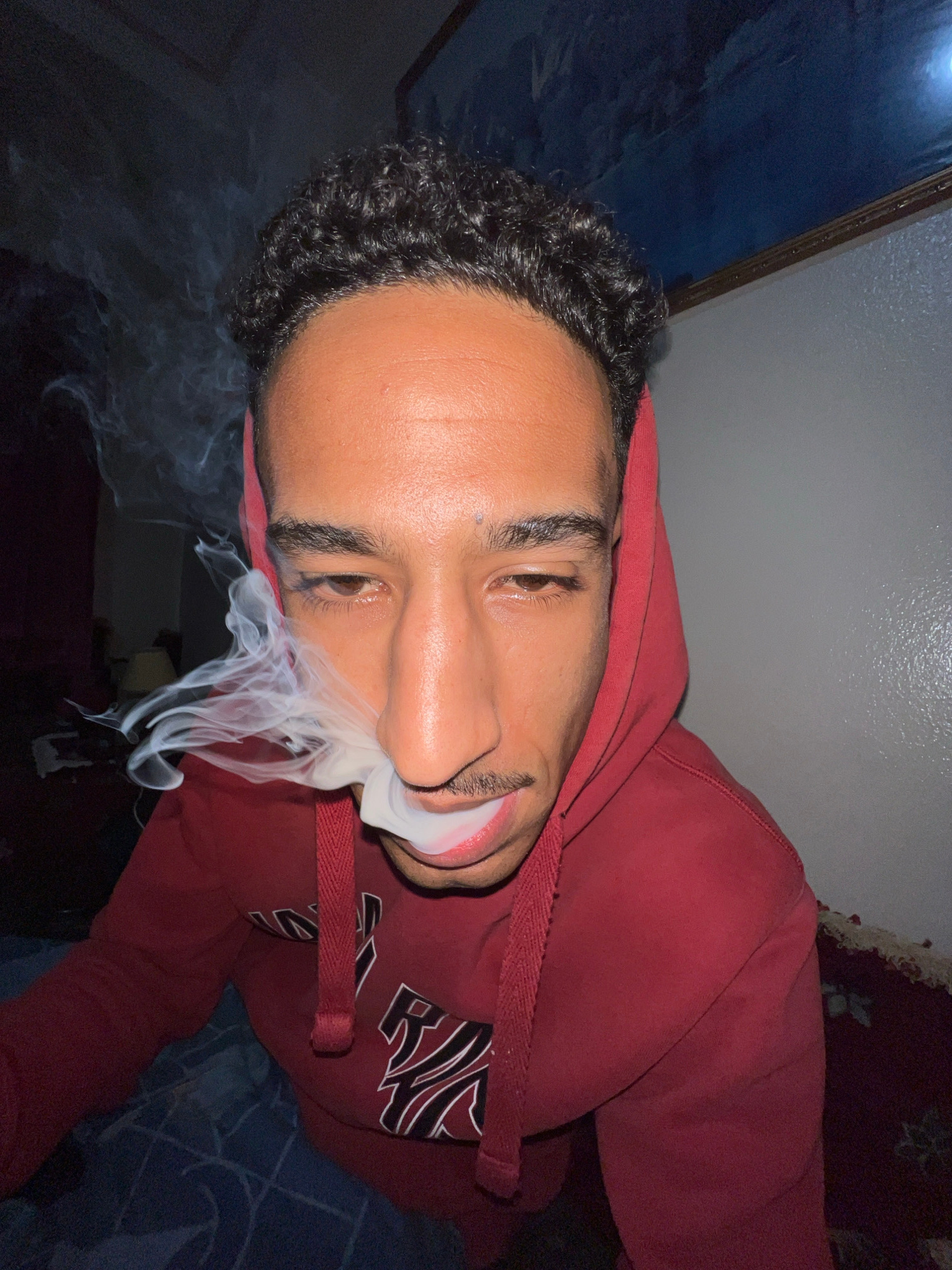 A man with dark, curly hair, brown eyes, and a thin mustache is exhaling smoke. He wears a red hooded sweatshirt with a white logo. The background consists of a blue and white wall or tapestry on theβ¦read more