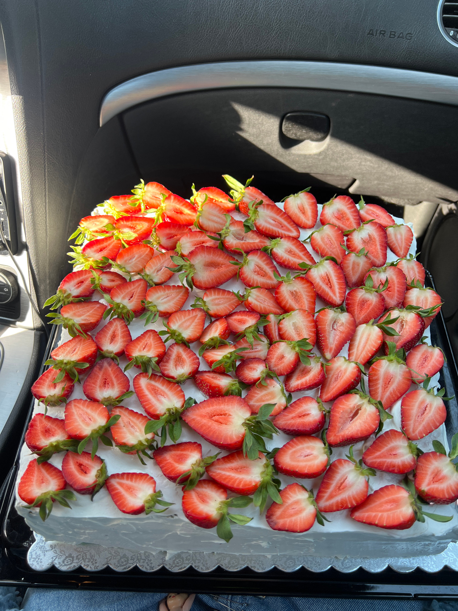 A rectangular cake topped with halved strawberries is on the dashboard of a vehicle. The dashboard is black with a silver accent. A portion of the vehicle's door panel is visible. Part of a person's c…read more