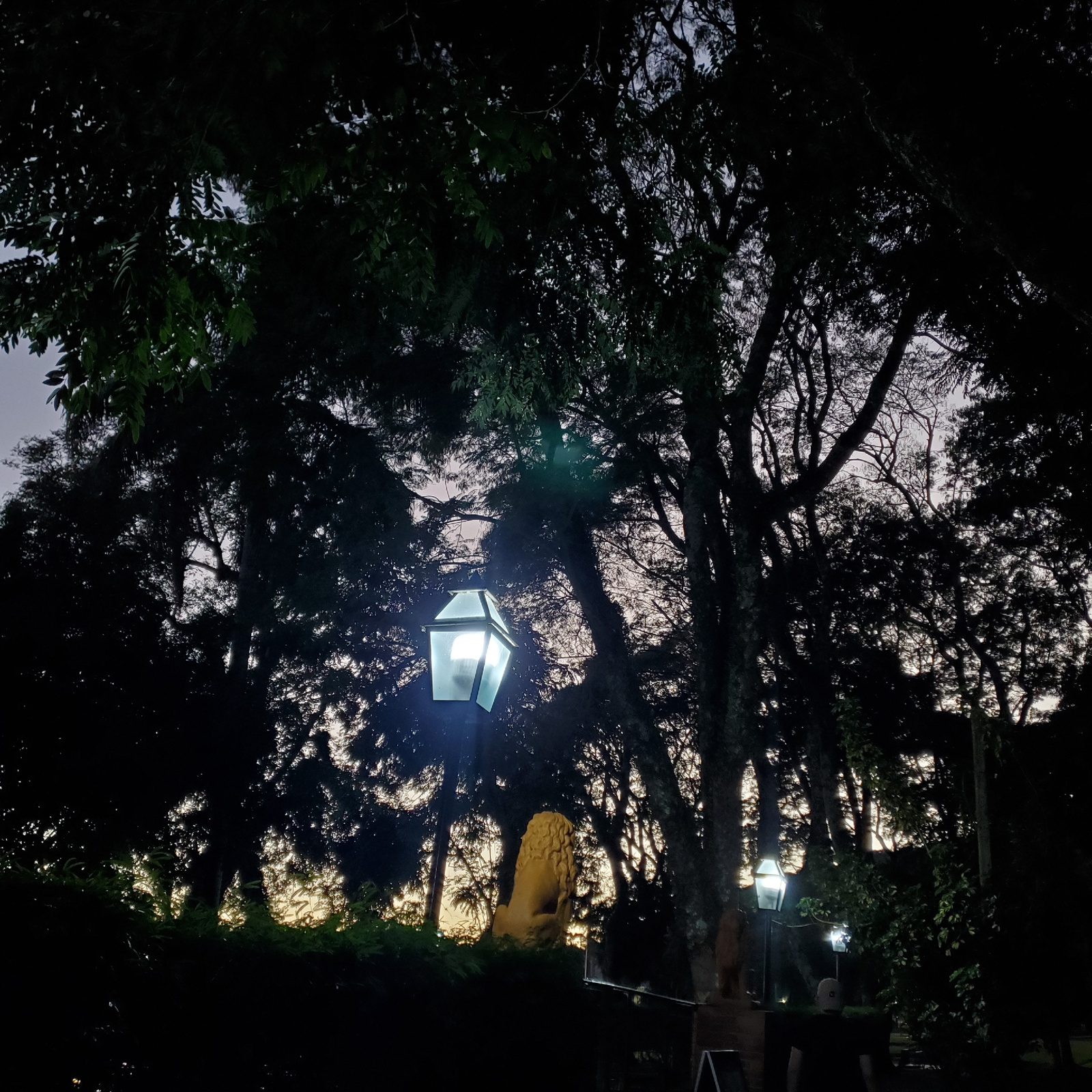 The image, taken at night in Curitiba, Brazil, presents a low-angle view of a park or garden setting. Dominating the foreground and midground are dense tree branches and foliage, creating a silhouette…read more