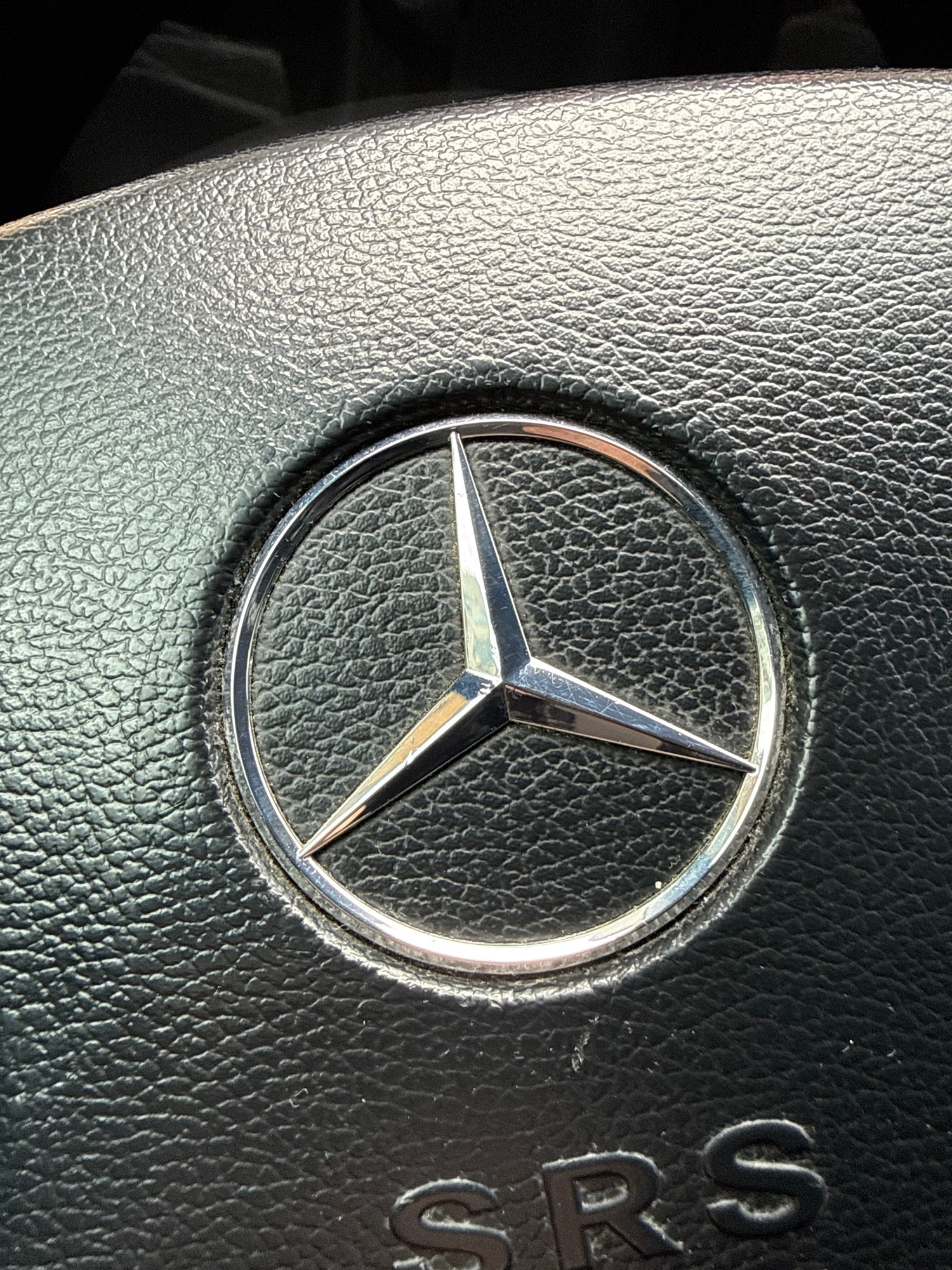 The image shows the steering wheel of a Mercedes-Benz. The central emblem, a silver three-pointed star within a silver ring, is prominently displayed. The steering wheel is covered in black textured l…read more