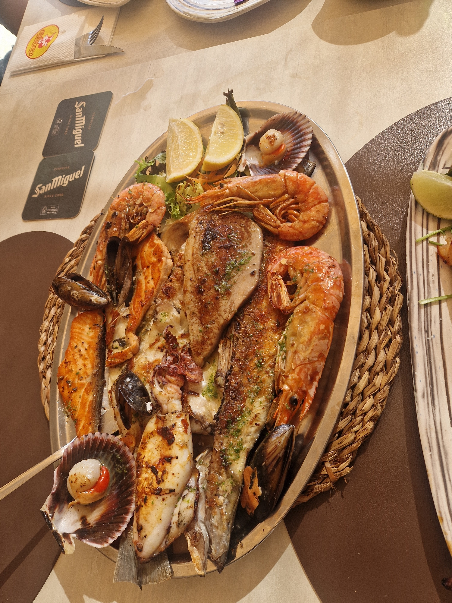 A high-angle, well-lit medium shot shows a metal oval serving platter filled with various cooked seafood items. These include prawns, mussels, grilled fish fillets, calamari, and scallops served in th…read more