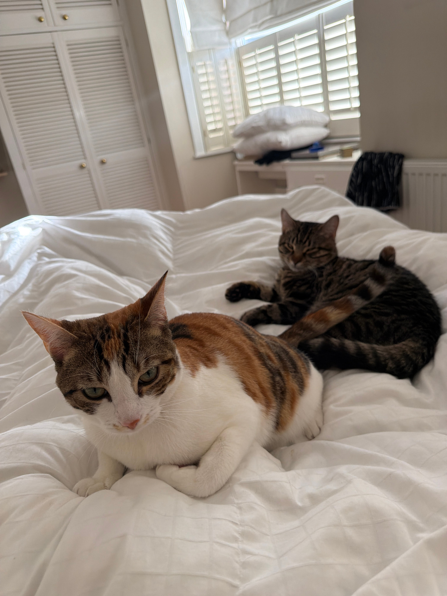 The image captures a peaceful indoor scene featuring two cats resting on a white bed, illuminated by natural daylight. The photograph is oriented vertically, with the room's interior elements position…read more