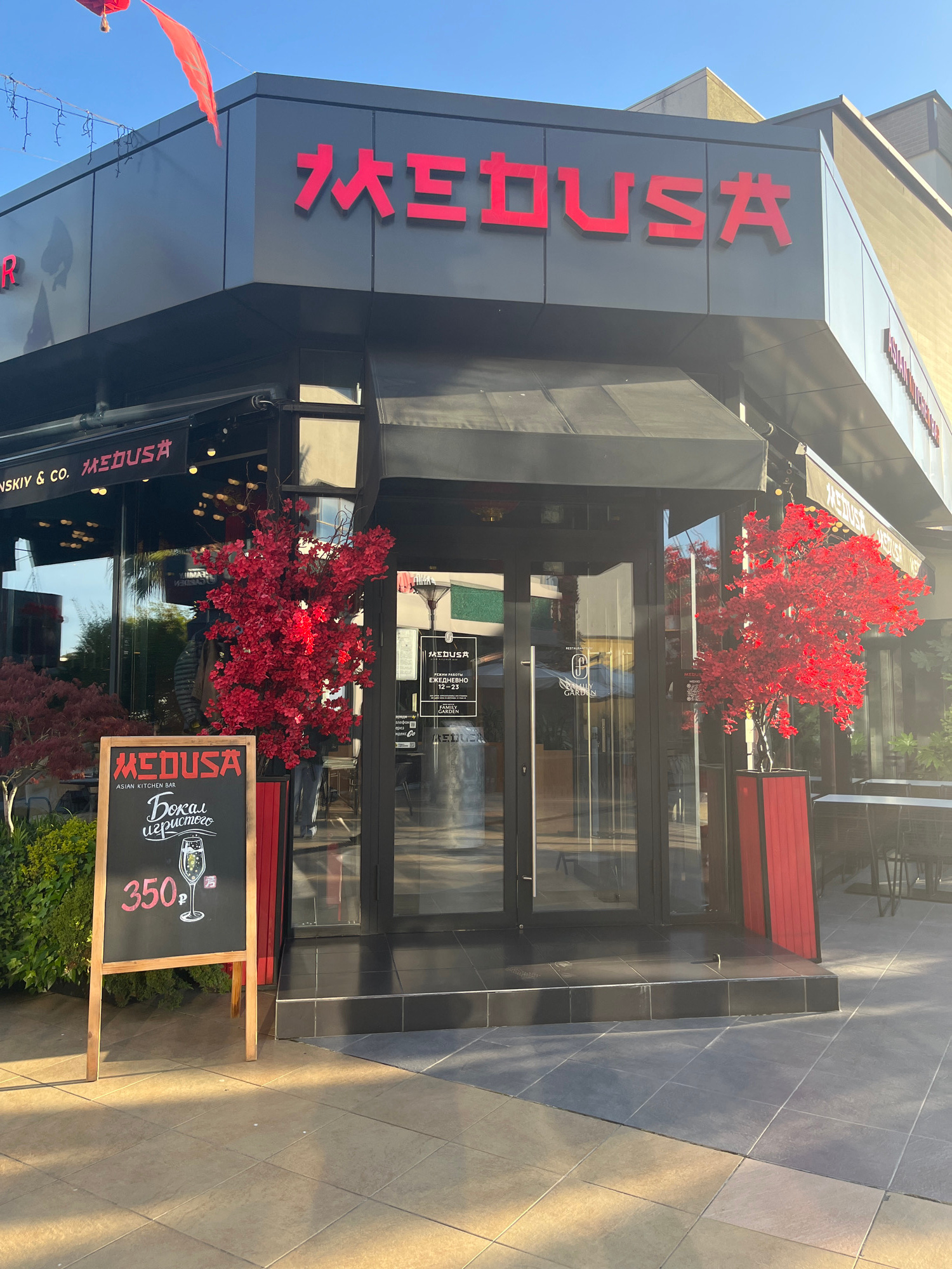 The image shows the exterior of "MEDUSA," an Asian Kitchen Bar located in Sochi, Russia. The restaurant's name is displayed in red capital letters both vertically on the building's façade and horizont…read more