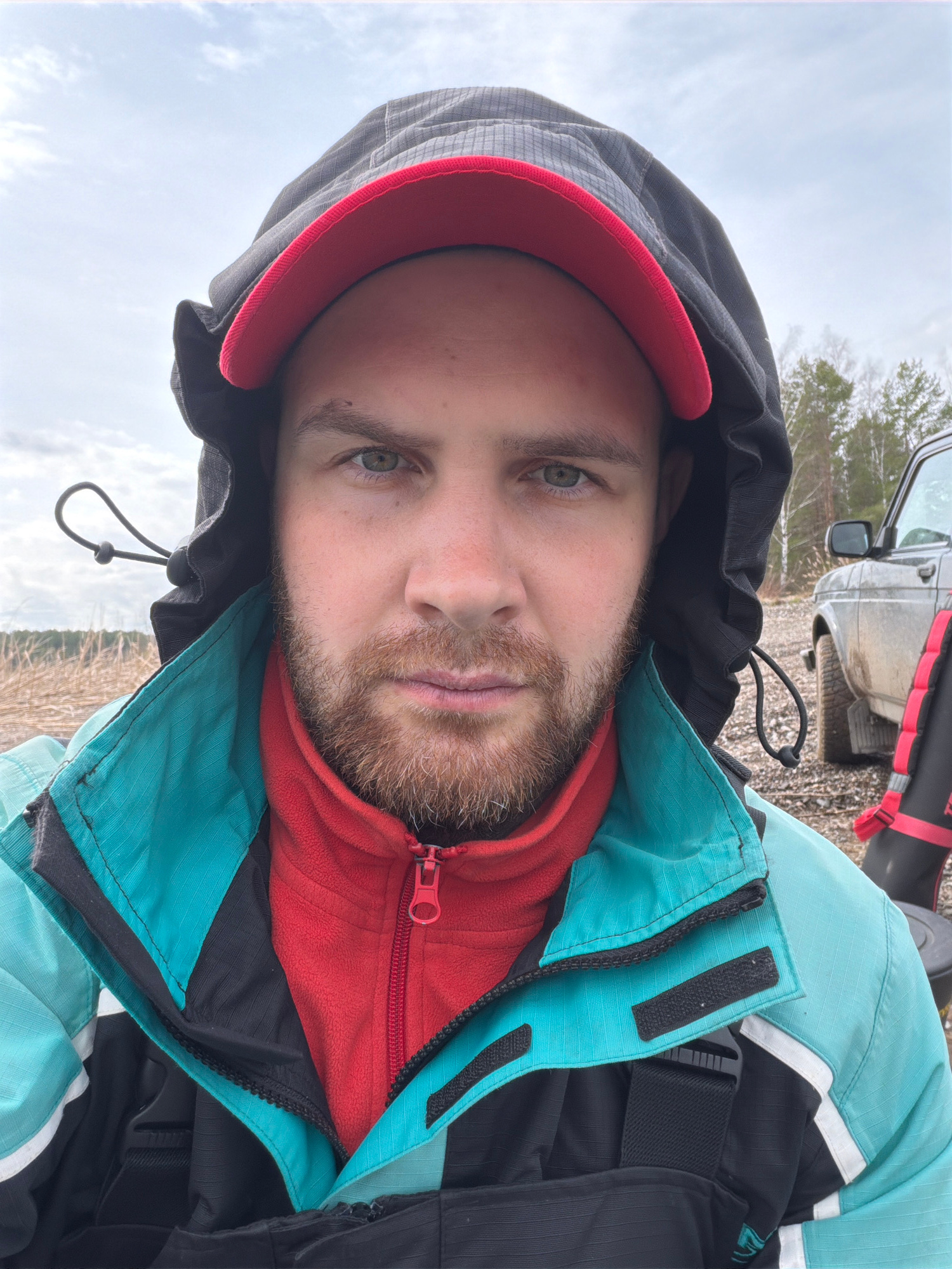A selfie taken in an outdoor setting, possibly near Chaikovsky, Russia. A man with a beard wears a hooded jacket with a red inner layer and a blue and black outer layer. The background includes a car,…read more