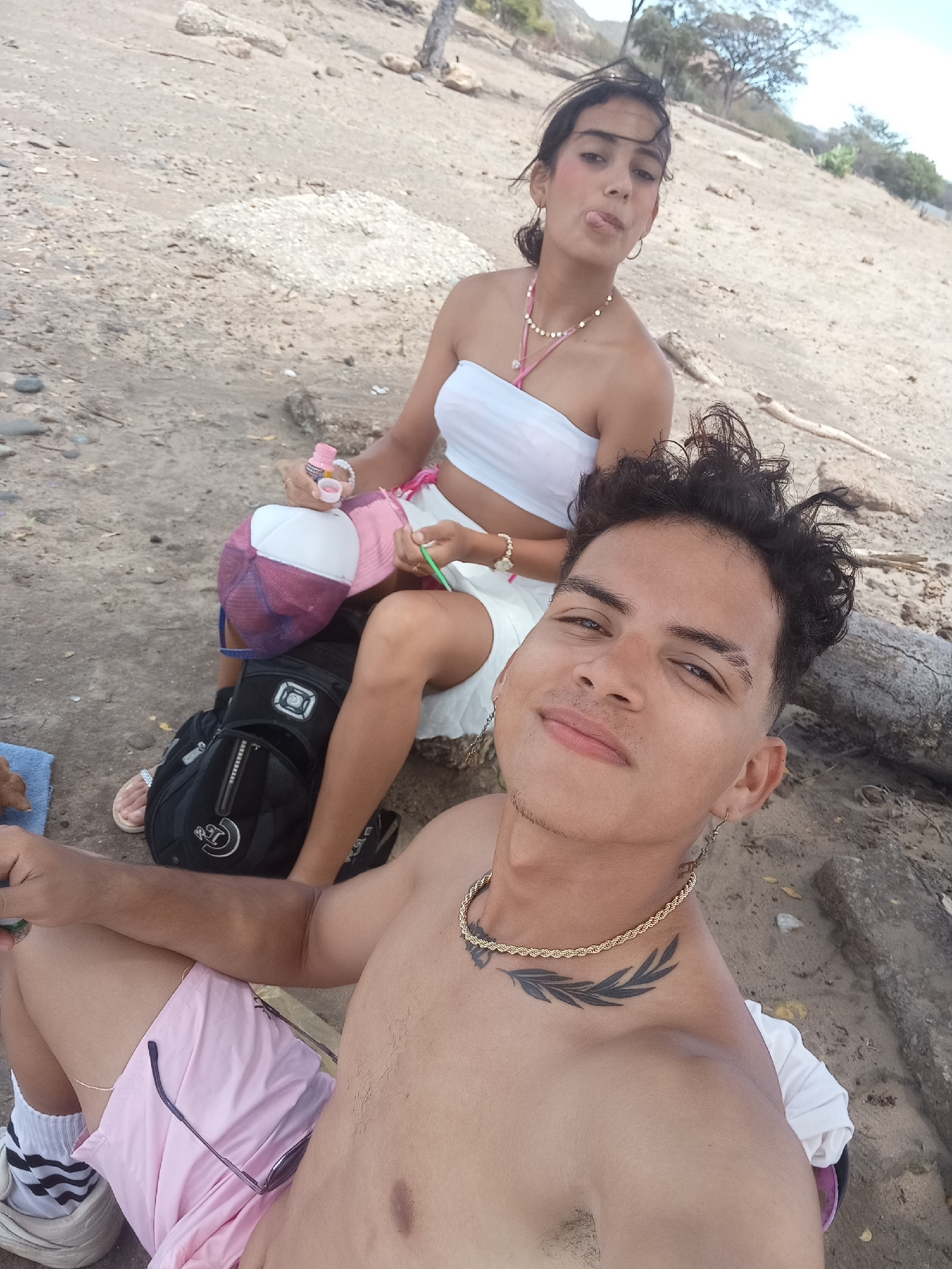 Two individuals are posing for a selfie at a beach in Altagracia, Venezuela. The foreground focuses on a shirtless male wearing pink shorts, white socks with black stripes, and sneakers. He has a gold…read more