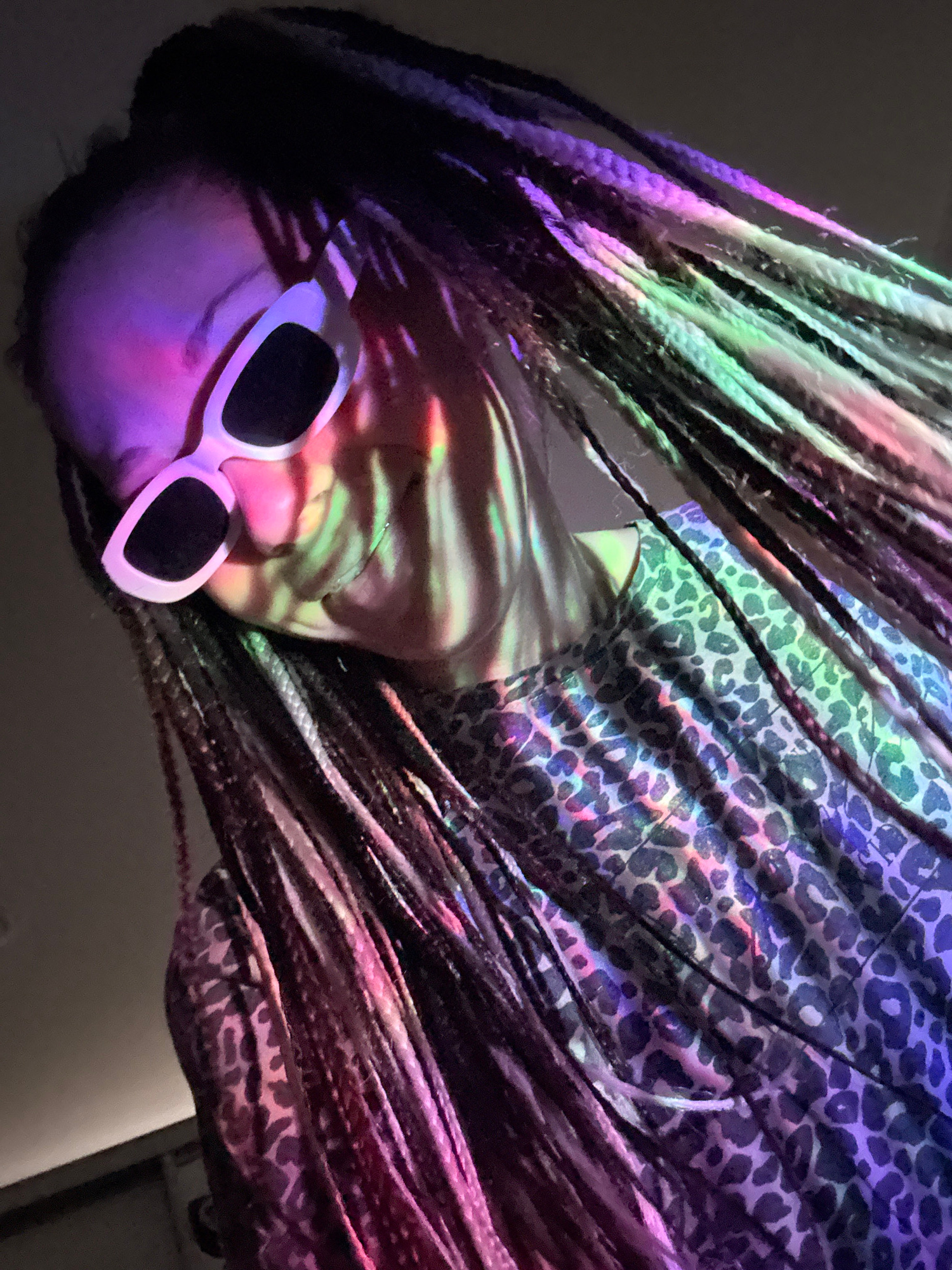 The image shows a person with braided hair, wearing white sunglasses, and an animal print shirt. The person is likely indoors. The lighting is colored with pink, green, and blue hues. The person is lo…read more