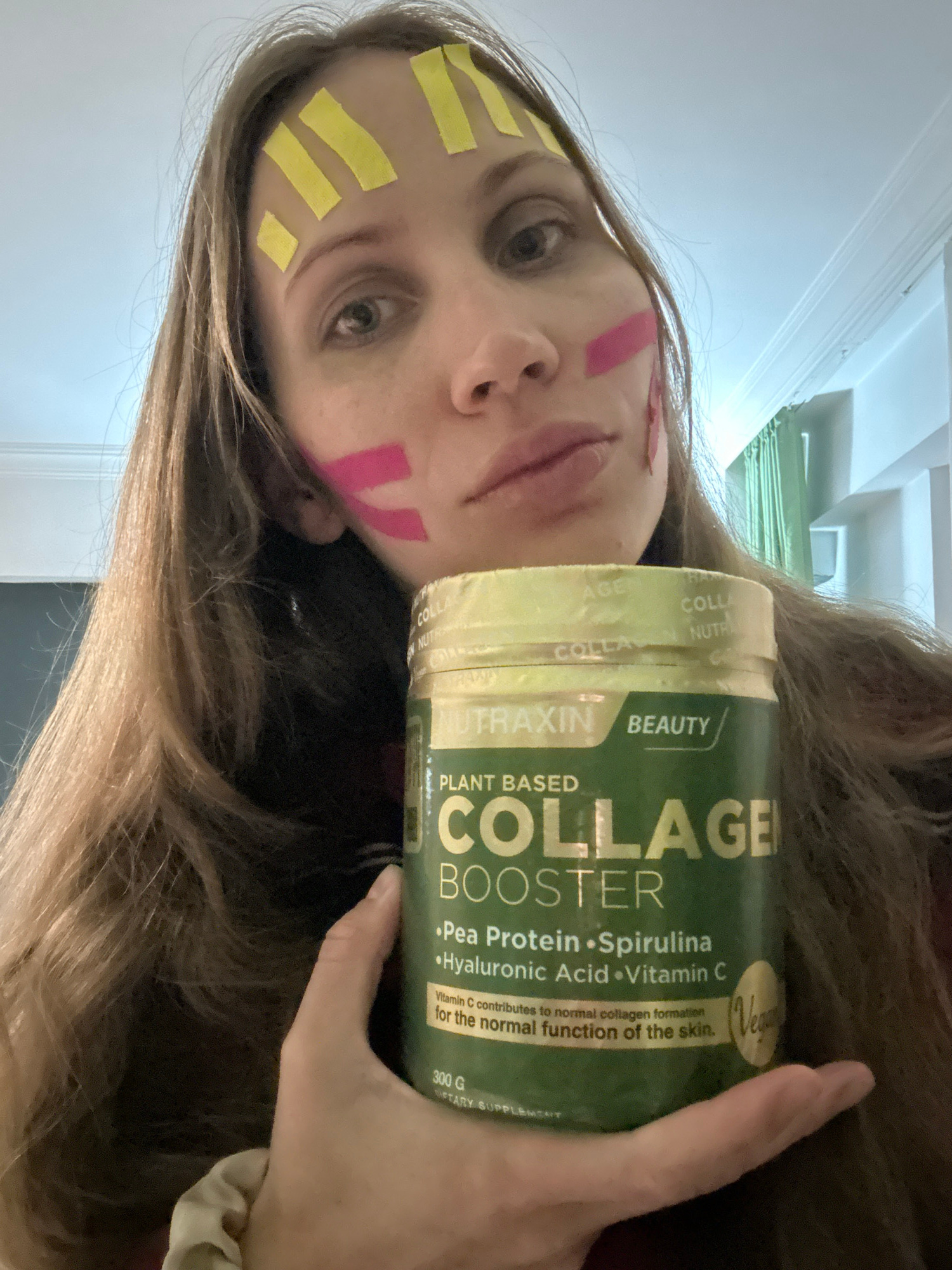 A woman is holding a container of "Collagen Booster" by Nutraxin Beauty, which is a plant-based product containing pea protein, spirulina, hyaluronic acid, and Vitamin C. She has yellow and pink tape…read more
