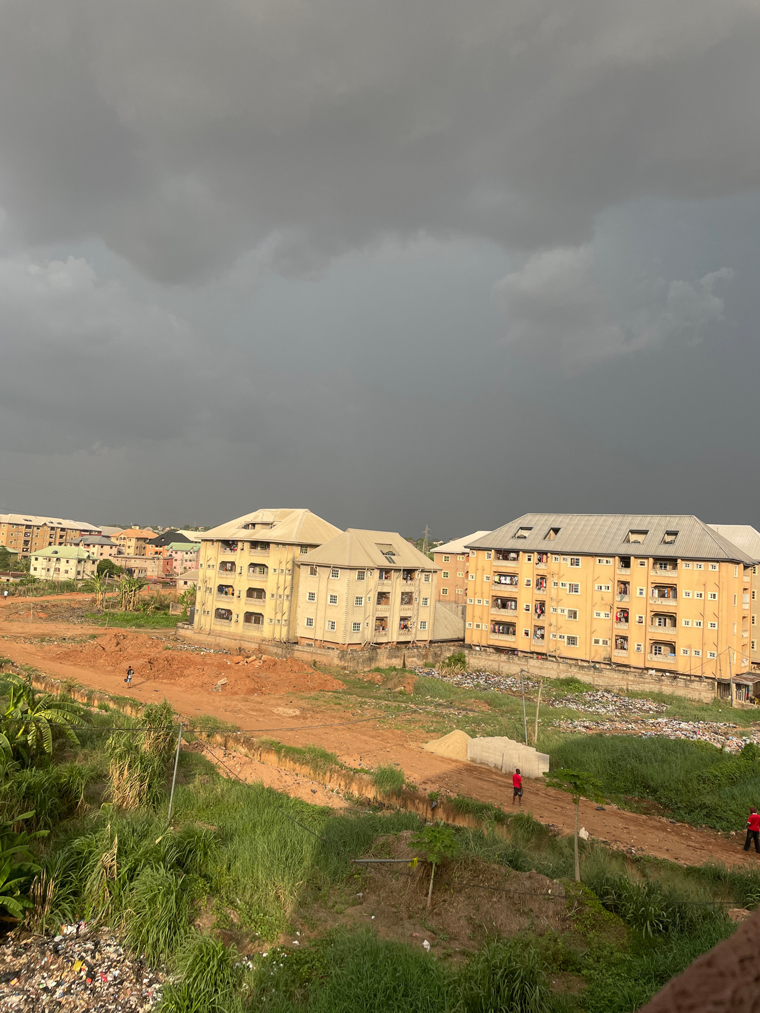 The image shows an urban scene in Onitsha, Nigeria, under a heavy, overcast sky. Several multi-story residential buildings are visible, characterized by yellow facades, metal roofs, and numerous windo…read more