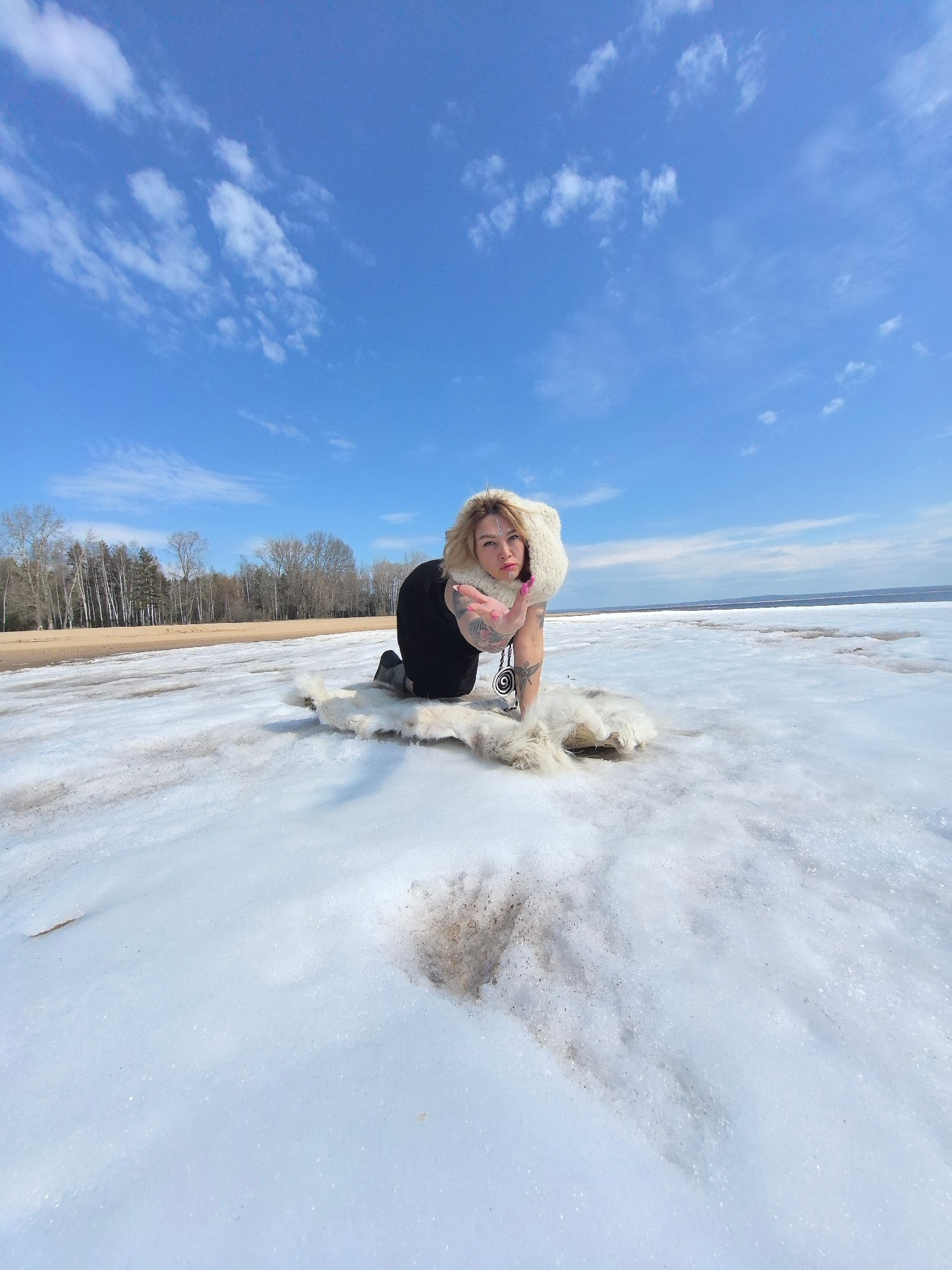 A woman poses on a vast, snow-covered landscape under a bright blue sky with scattered white clouds. She has blonde hair and is wearing a white furry hood or scarf, a black top, and black pants. She iā¦read more