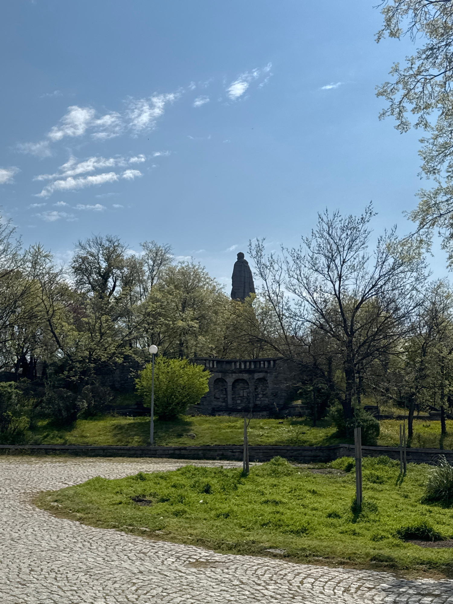 A bright, daytime outdoor scene captures a historical monument amidst lush greenery under a clear blue sky, likely in Plovdiv, Bulgaria. The central subject is a towering, dark stone monument, possibl…read more