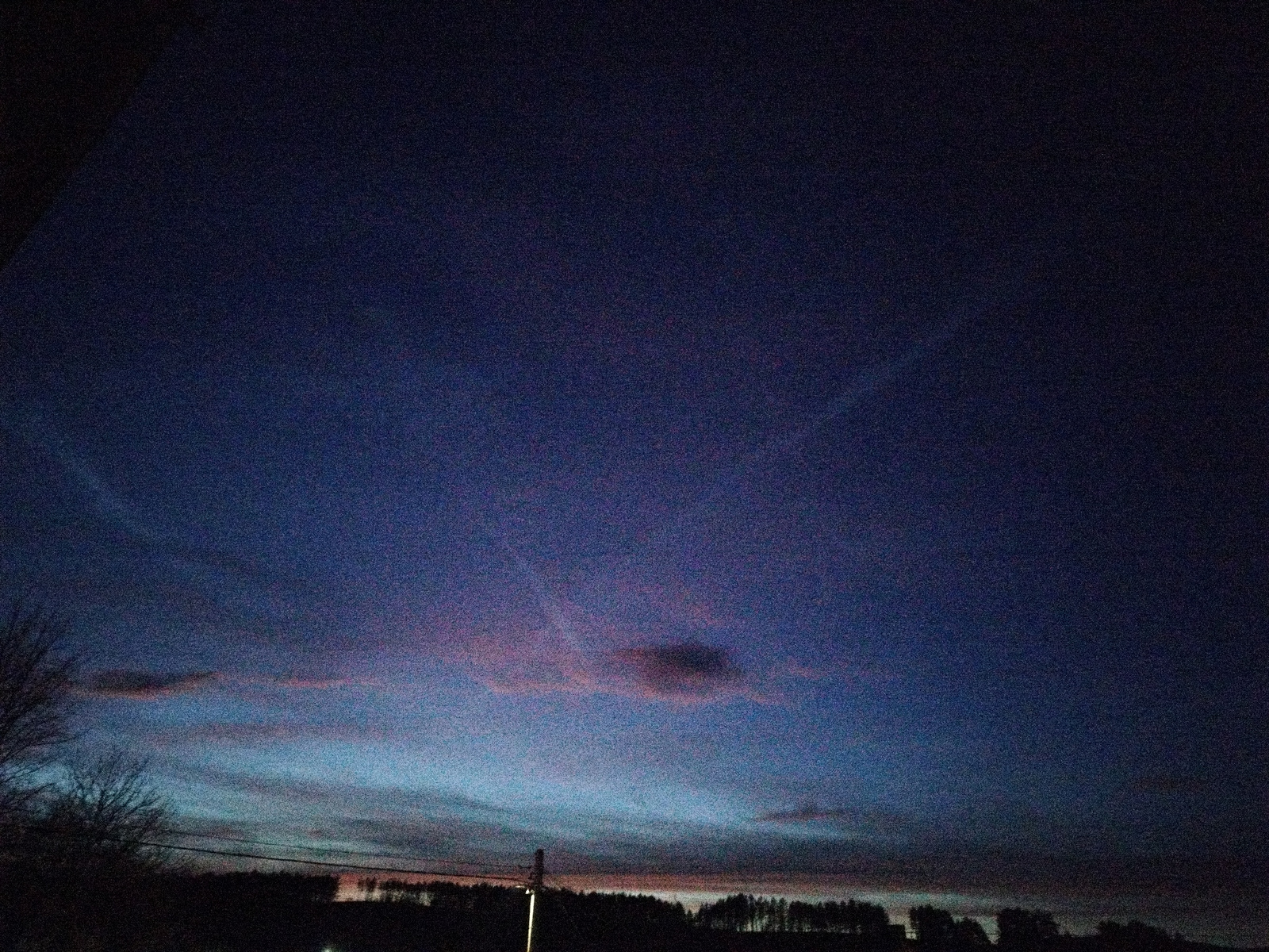 The image displays a twilight sky over a silhouetted landscape, captured with noticeable digital noise or grain due to low light conditions. The sky dominates the frame, showcasing a gradient of color…read more