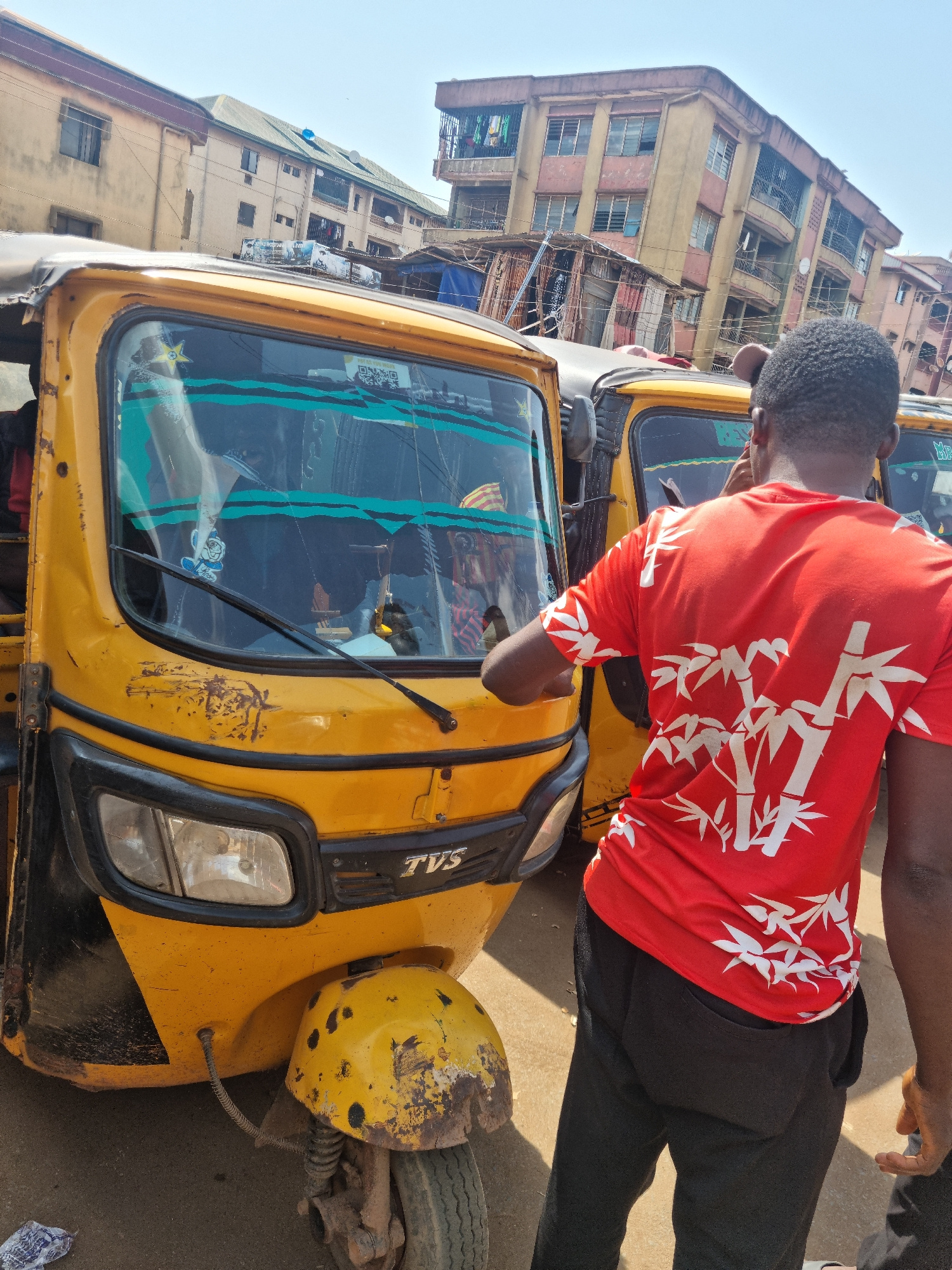 This daytime image, set in Obosi, Nigeria, presents an urban street scene centered around a man and a yellow auto-rickshaw. The perspective is angled, looking down on the subjects. The main subject i…read more