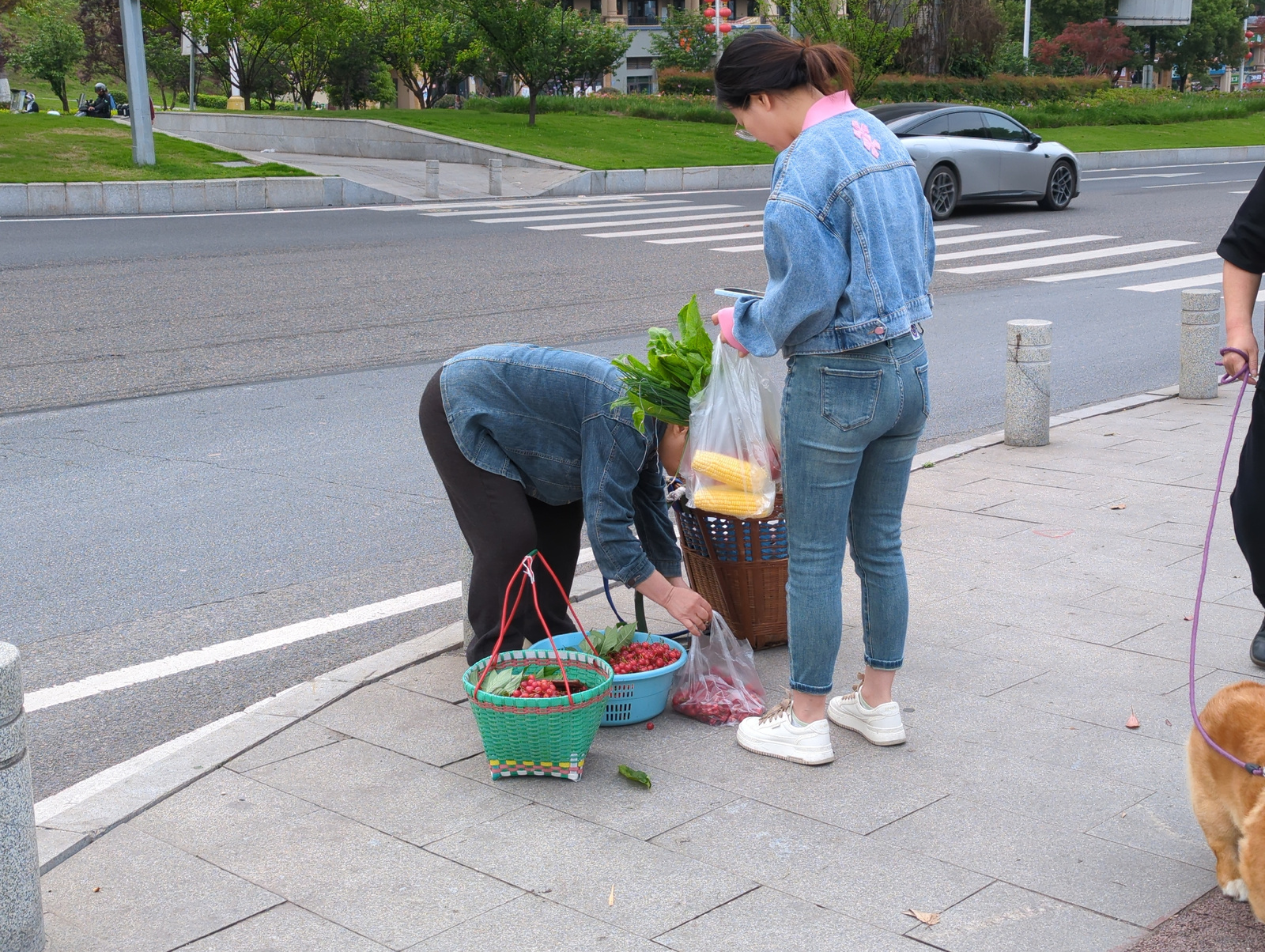 This image captures an urban street scene in Jiangjin, China, focusing on two women and a small produce stand on a sidewalk. One woman, wearing a blue denim jacket and dark trousers, is bent over, act…read more