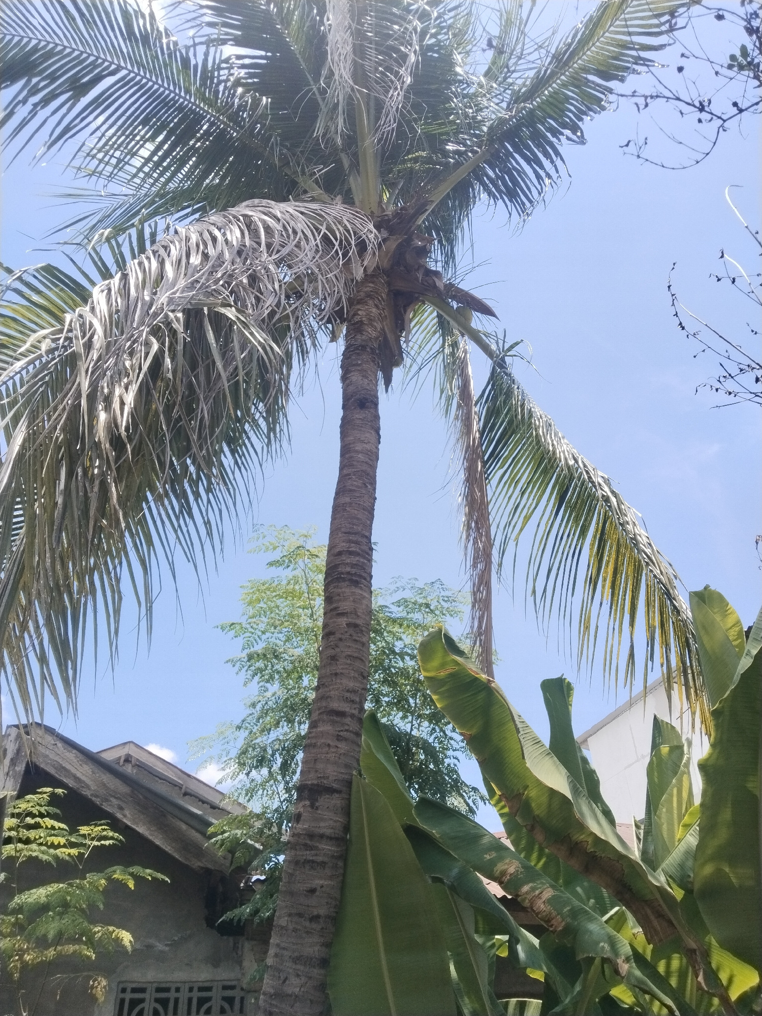 The photograph depicts a tall coconut palm tree in Lhokseumawe, Indonesia, under a clear blue sky. Some fronds are green, while others are dry and gray. Other trees are visible in the background, as w…read more