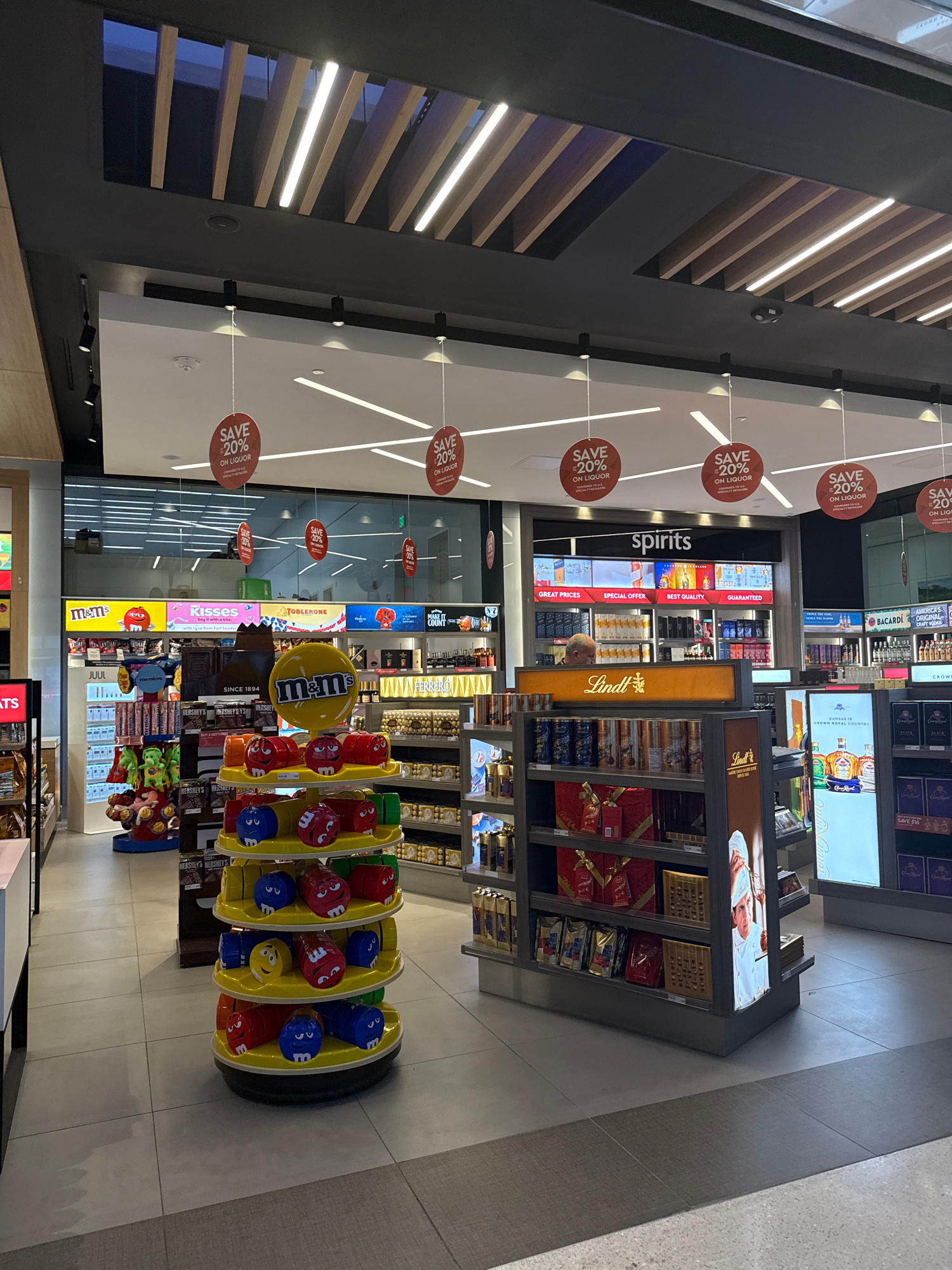 The image shows a retail store, likely in an airport, with a focus on liquor and candy. The store is well-lit with a modern design featuring a ceiling with alternating light and dark wood panels. Prom…read more