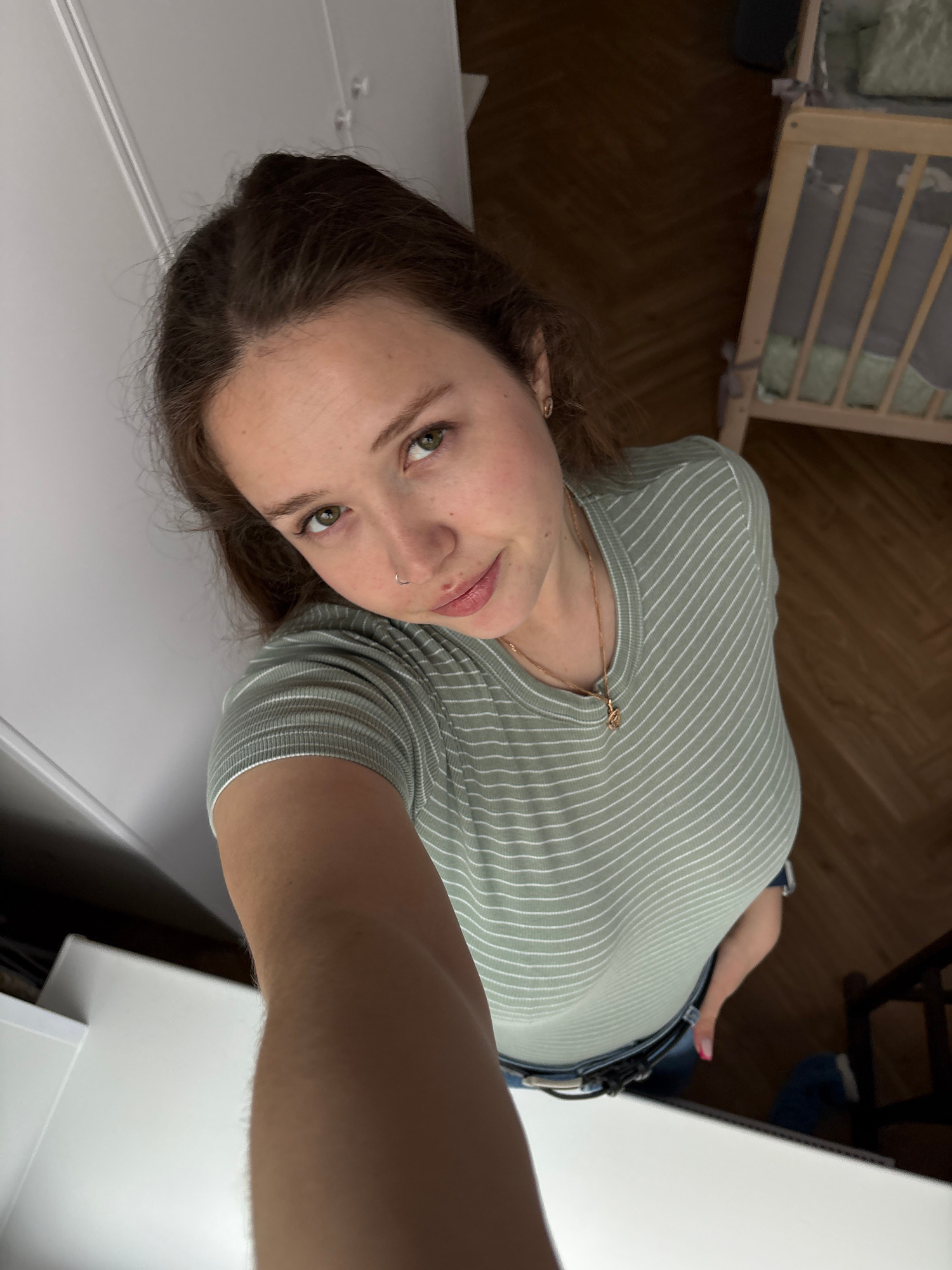 A young woman is shown in a selfie-style photograph, appearing from a high angle. She is wearing a light green and white striped t-shirt and a thin gold necklace. She has brown hair and fair skin. The…read more