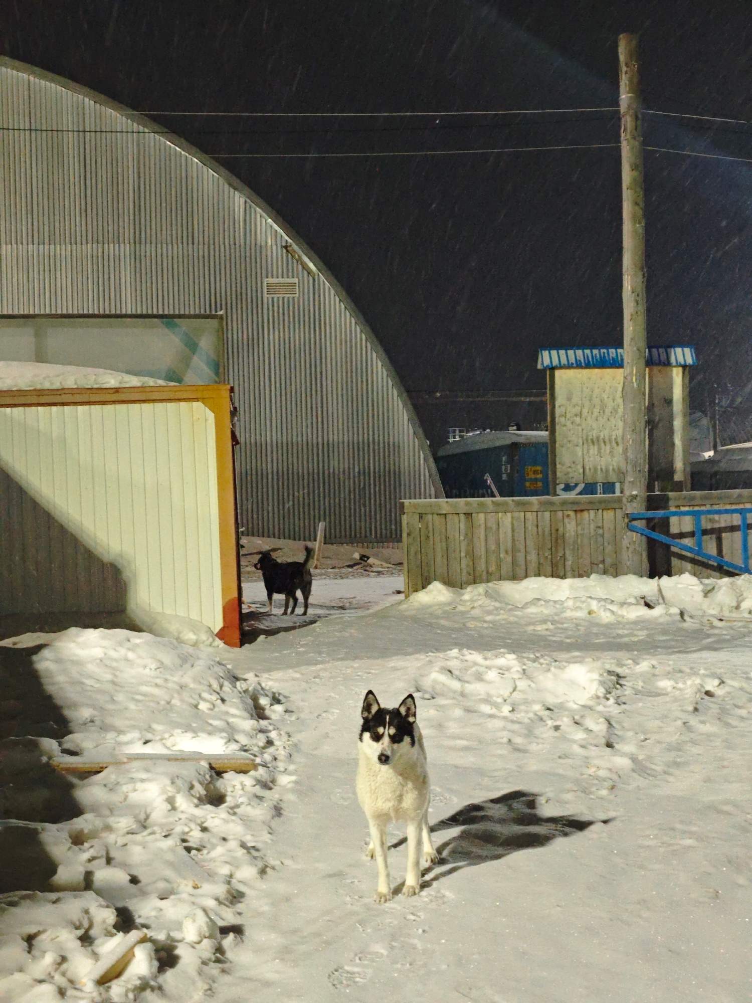 The image depicts a snowy outdoor scene at night in Unknown, Russia. In the foreground, a medium-sized dog with a white body and black markings around its eyes and ears stands facing the camera. Behin…read more