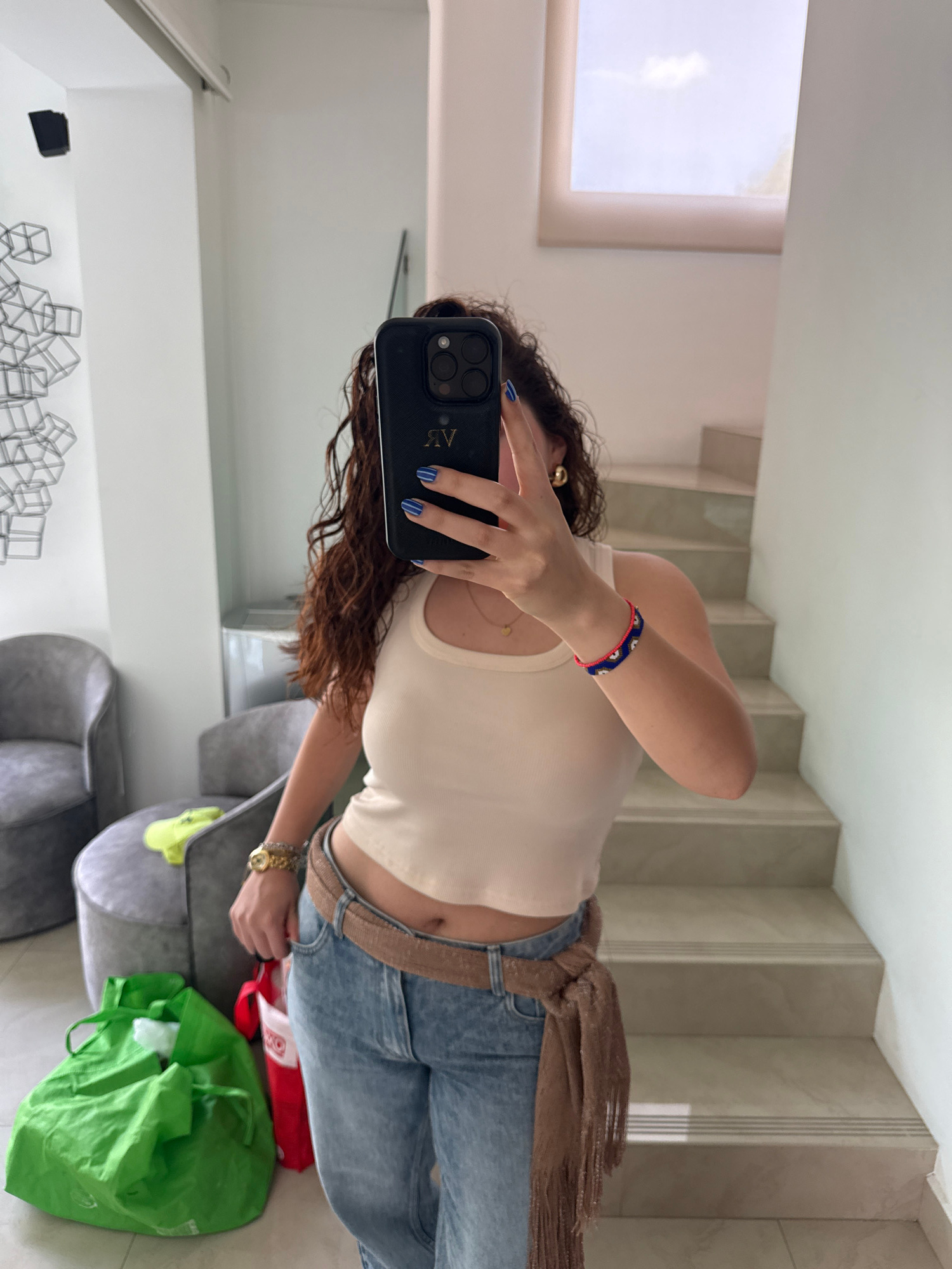 A woman is taking a selfie in a mirror. She is holding a black phone with a monogram in her right hand. She is wearing a beige top, blue jeans with a brown belt, and a bracelet. Her nails are painted…read more