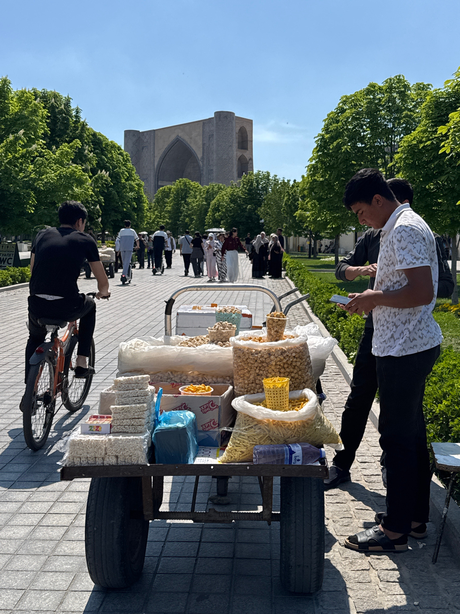 A street scene in Samarkand City, Uzbekistan, shows two men near a cart filled with snacks, nuts, and bottled water. One man is on a bicycle. The other is standing and looking at his phone. A group of…read more