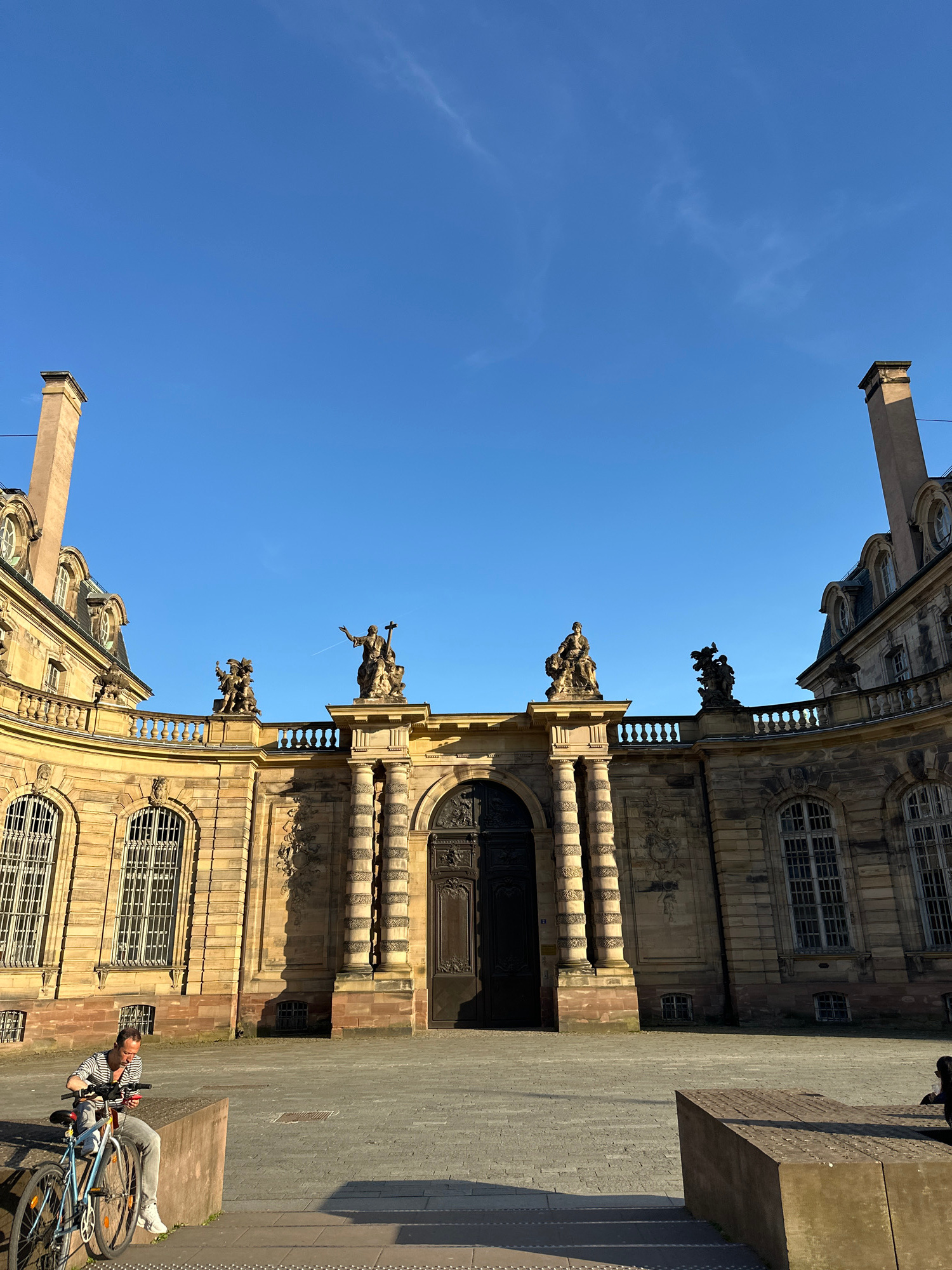 The image depicts a view of a building facade in Strasbourg, France, under a clear blue sky. The building features ornate architectural details including statues, columns, and arched windows with deco…read more