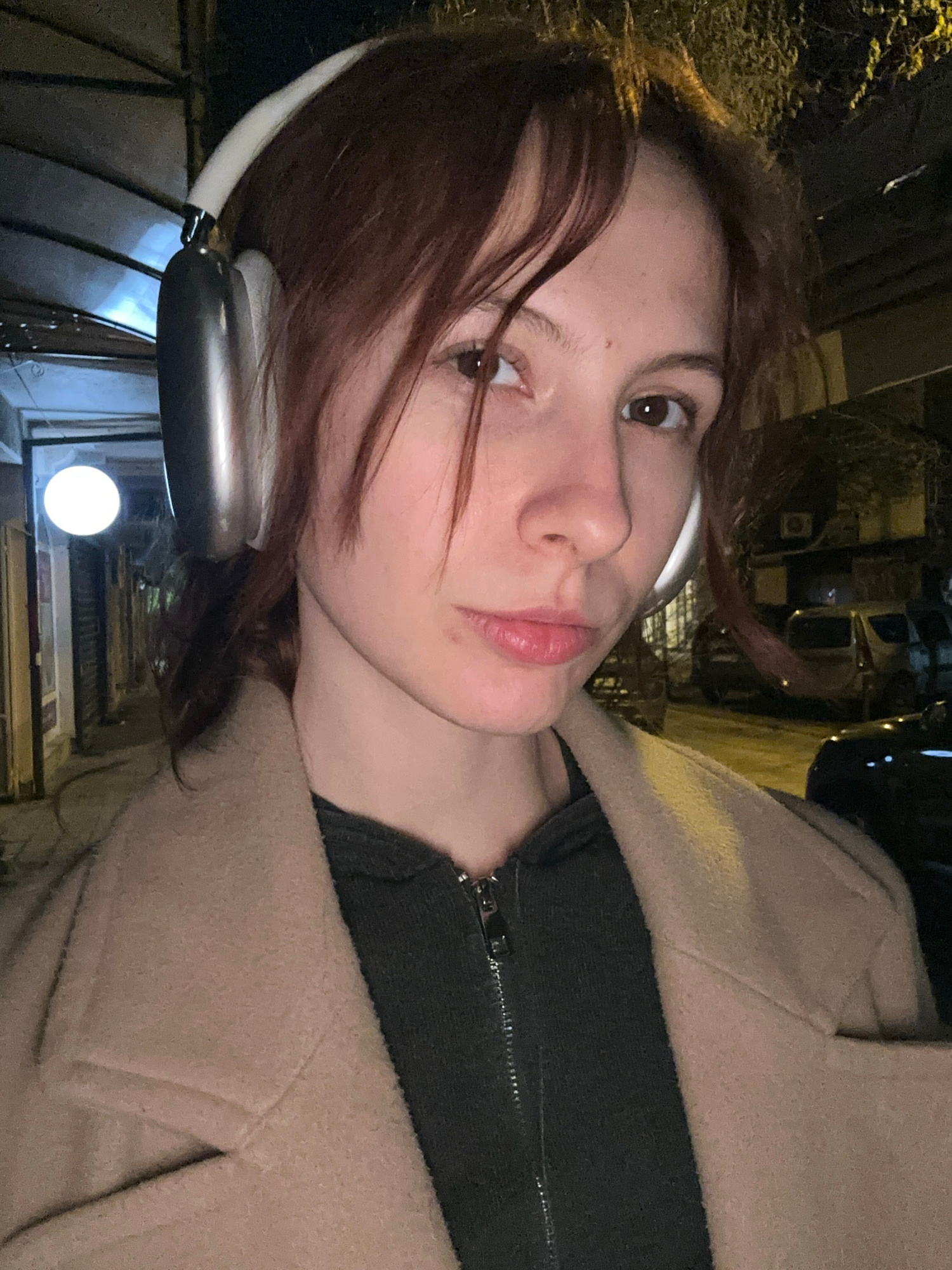 A selfie, rotated for a horizontal perspective, shows a woman wearing a beige coat over a dark-colored, zipped-up garment, and silver Apple AirPods Max headphones. The woman has reddish-brown hair and…read more