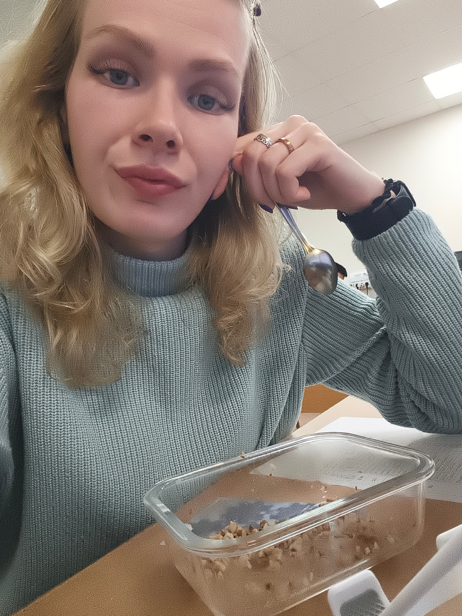 A woman is shown in a close-up selfie, seated at a desk. She has light blonde hair, blue eyes, and is wearing a light blue turtleneck sweater. A metal spoon is visible in her right hand, which is rest…read more