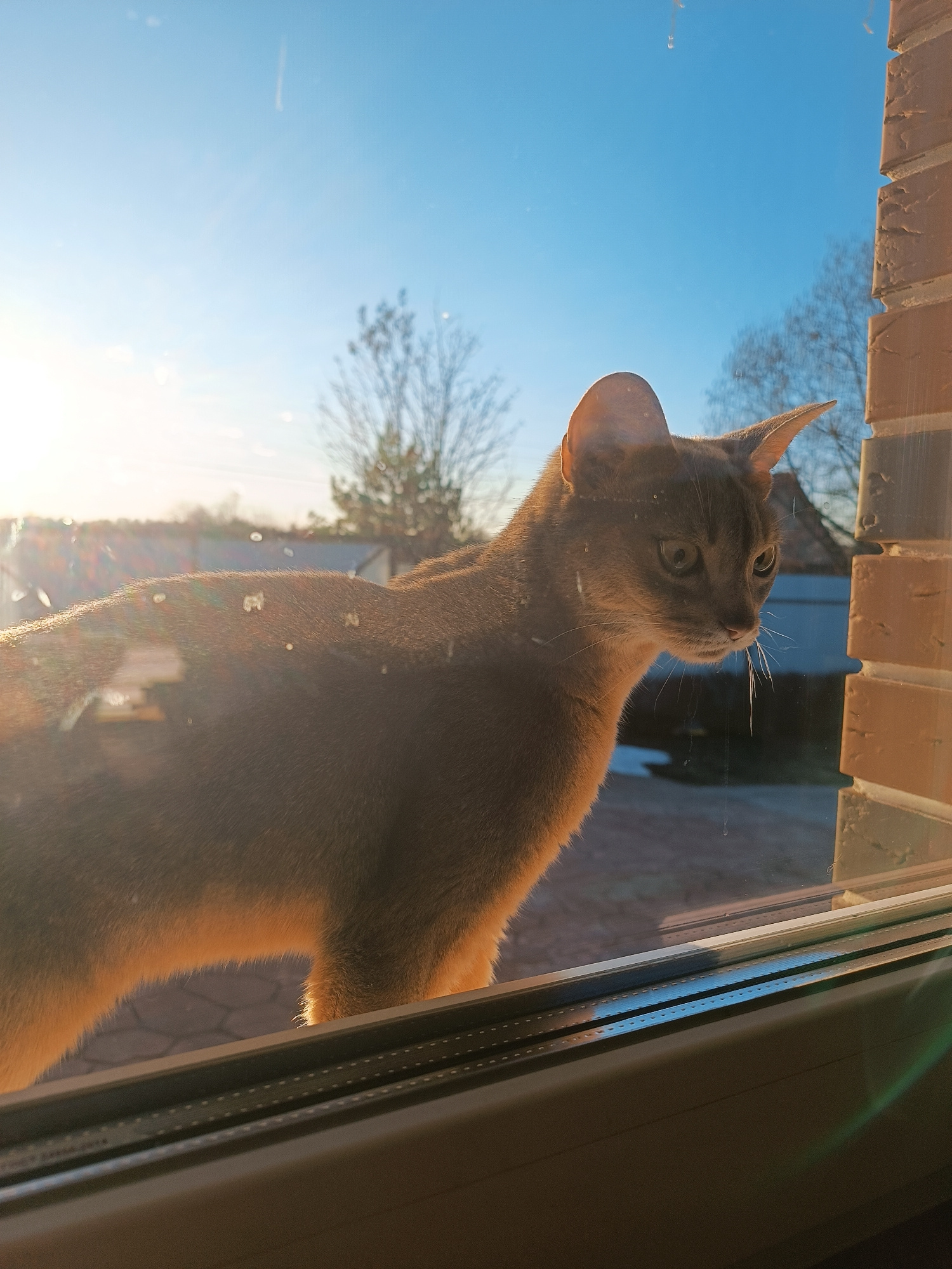 A brown cat is standing on a window sill, looking out of the window. The sky is blue and there are a few bare trees visible in the background. The sun is shining, creating a glare on the window. The l…read more