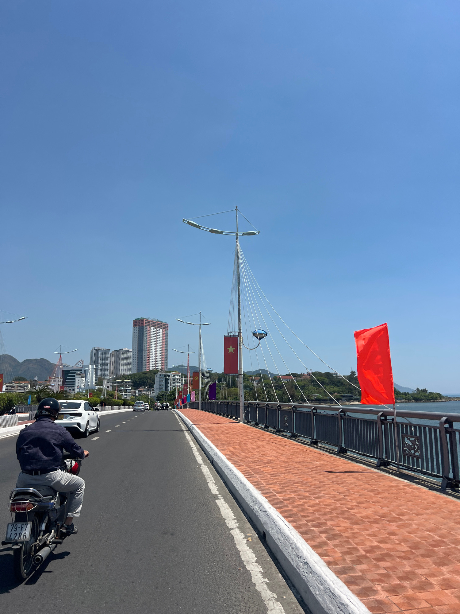 The photograph, taken in Nha Trang, Vietnam, shows a person riding a motorcycle on a bridge. The bridge has red brick side railings, a white concrete border, and a dark asphalt road surface. Several r…read more