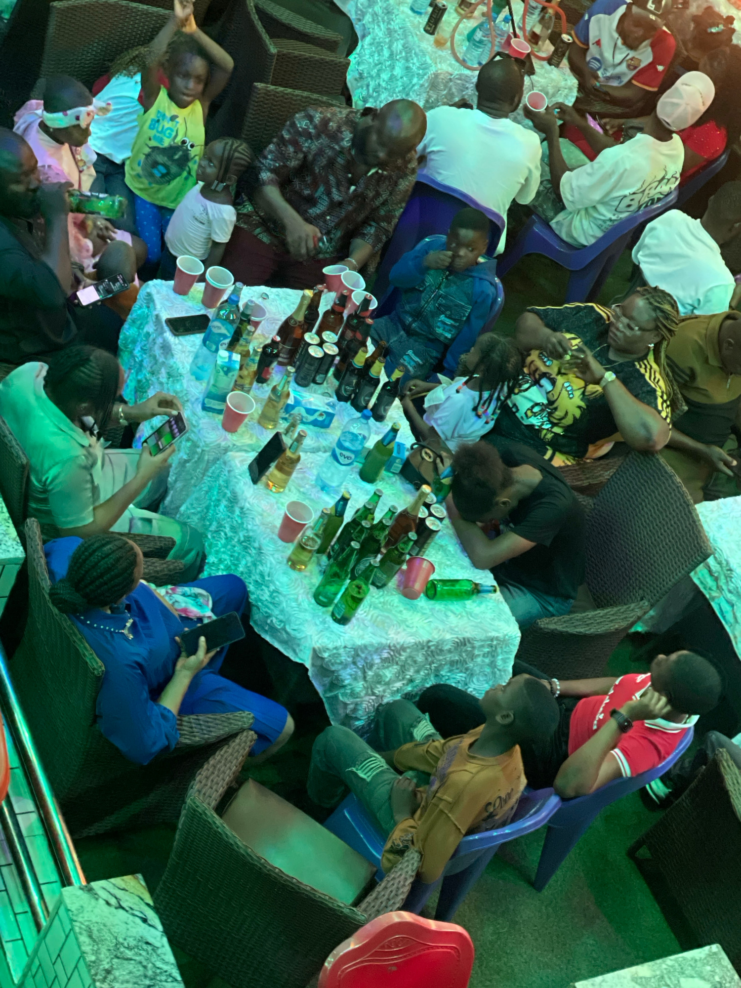 The image depicts an overhead view of a gathering of people around a table heavily laden with bottles, cans, and red plastic cups, potentially at a bar or recreational establishment. A large group ofโฆread more