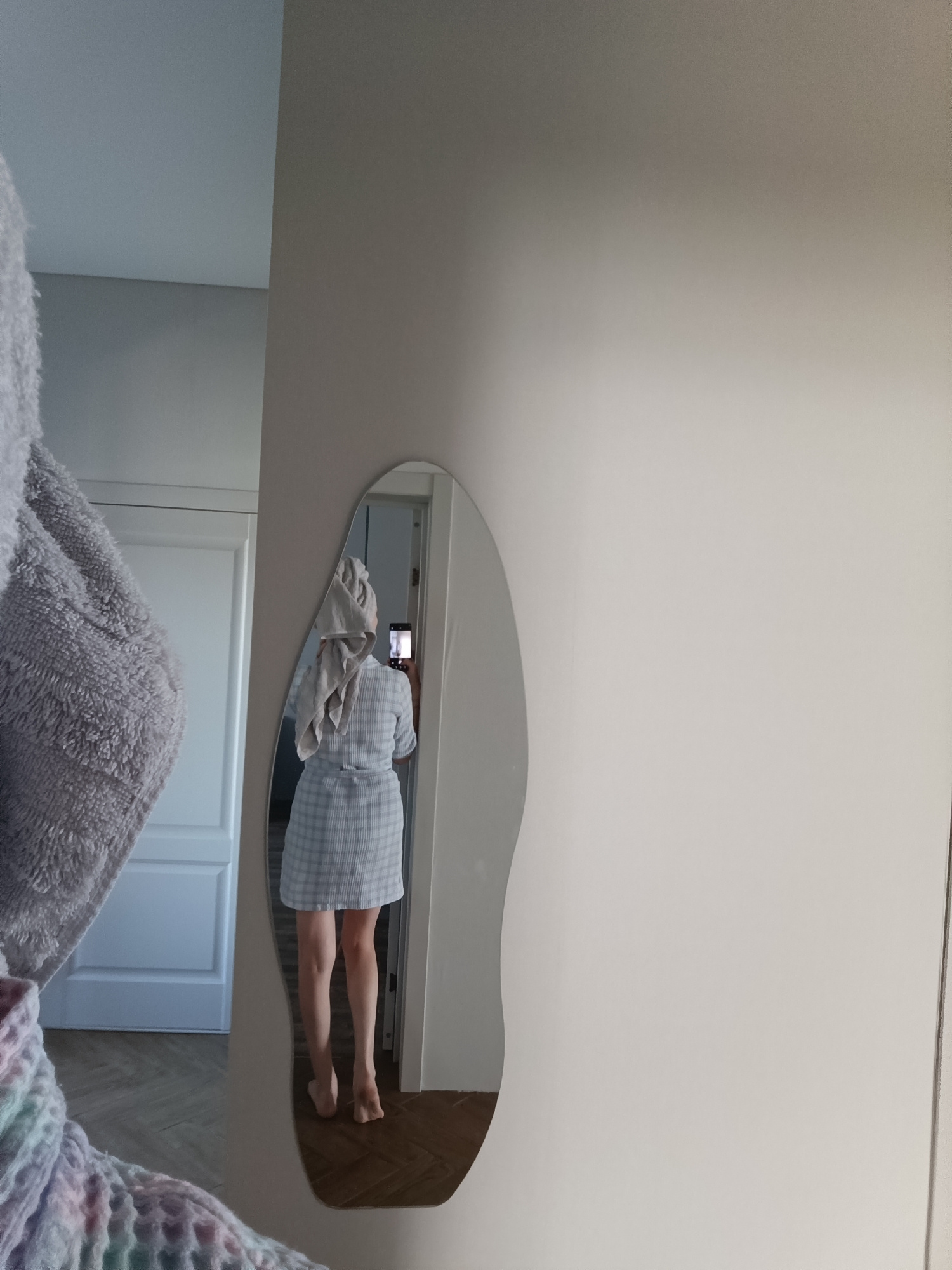 This image depicts an indoor scene in Chaikovsky, Russia. The primary subject is a person, seen from behind, reflected in an irregularly shaped wall mirror. The individual is wearing a light-colored,…read more