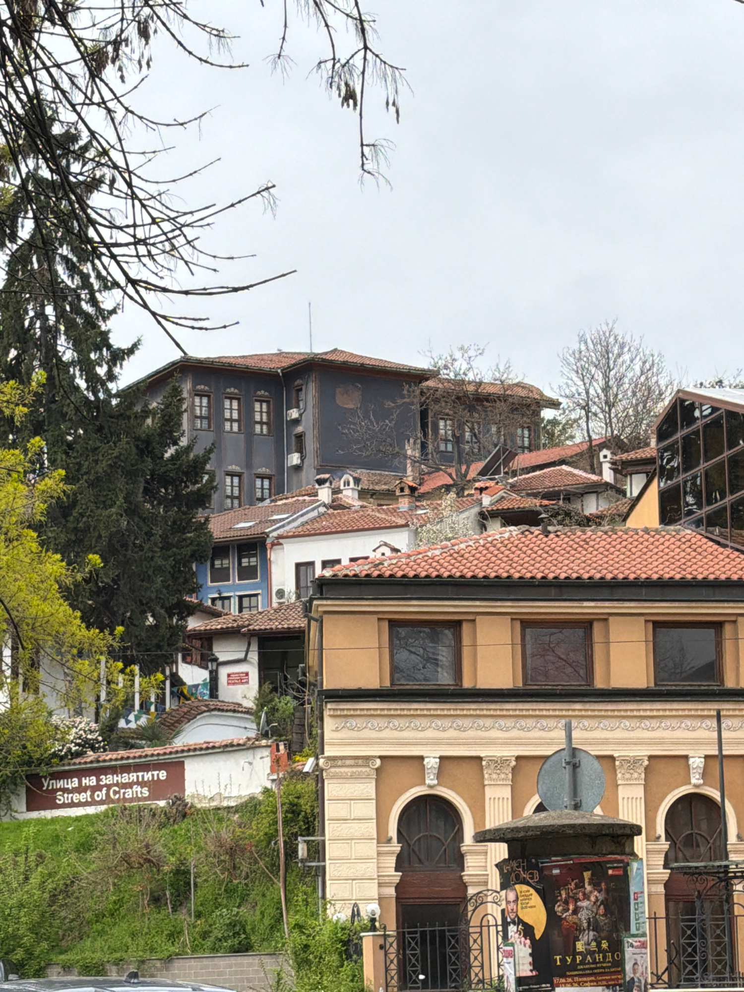 The image shows a street scene in Plovdiv, Bulgaria. On the right side of the image, there's a tall building with a beige facade. Its windows are rectangular and dark, and there is a circular architectural detail above each window on the top floor. A sign displaying posters is affixed to the building. Adjacent to the street is a sign that says "Улица на занаятите Street of Crafts," indicating the location. The street is lined with a low white wall overgrown with foliage. Further down the street, there are older buildings with darker facades and red-tiled roofs. Some trees are present, some with bare branches and some with budding green leaves. The sky is overcast. | Open Wire