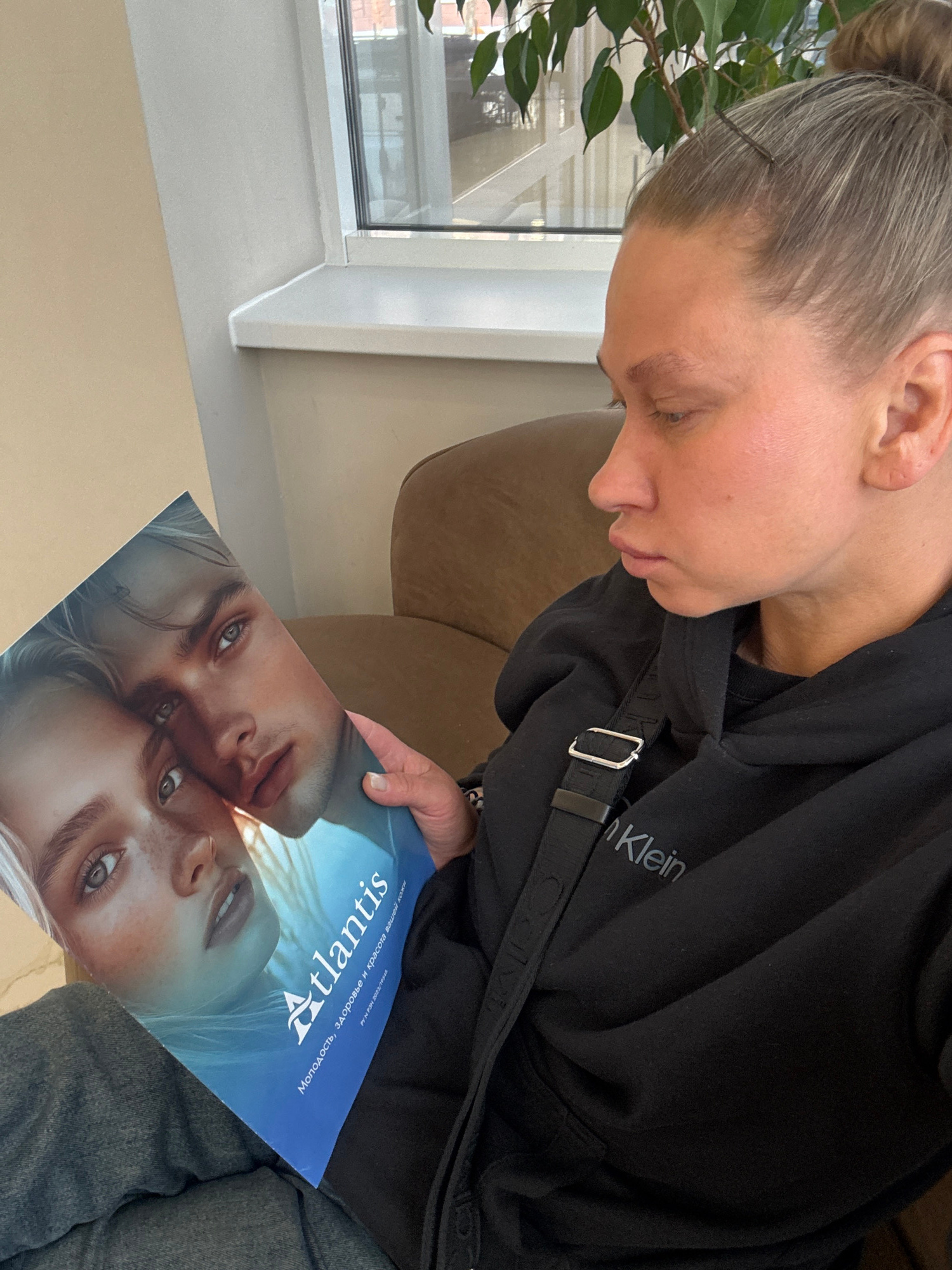 A woman with her hair pulled back into a bun is sitting and looking at a magazine called "Atlantis". She is wearing a black Calvin Klein sweatshirt and gray jeans. A black strap crosses her chest. The…read more