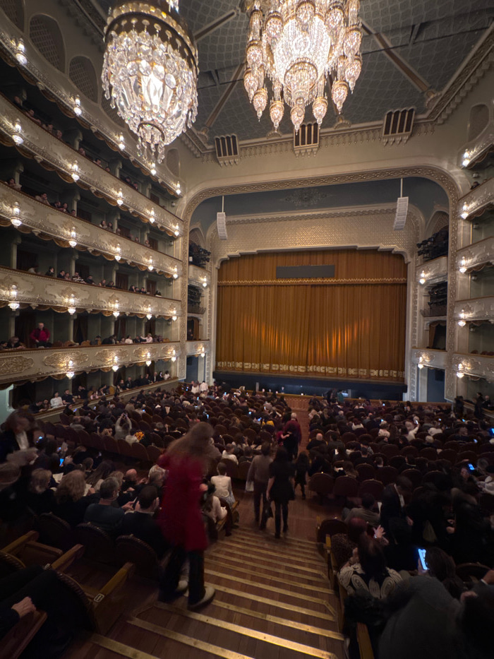 The image shows the interior of an ornate theater, viewed from a high vantage point. A large, crystal chandelier hangs prominently on the left. The theater is packed with an audience facing a closed s…read more