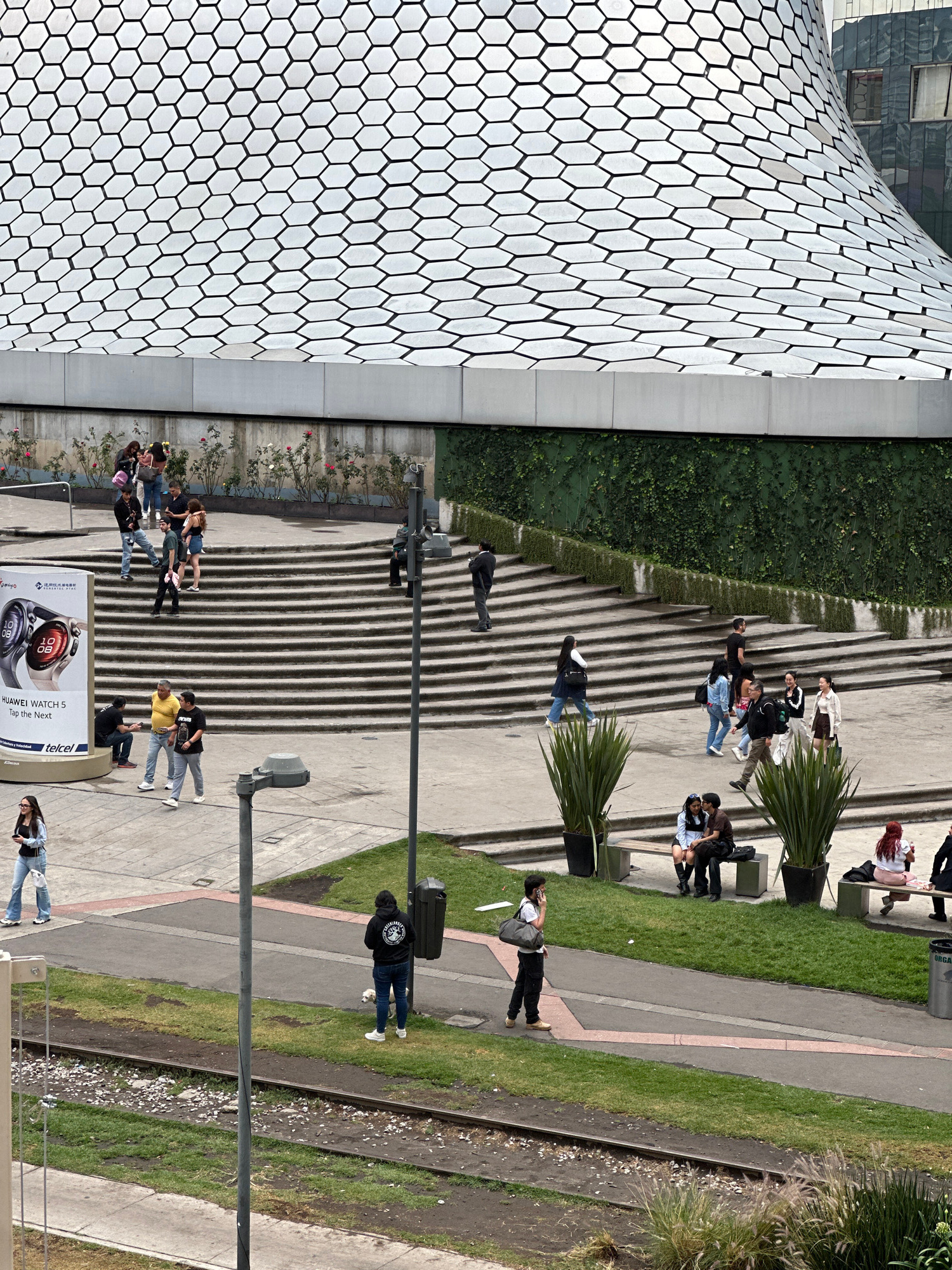 The image shows an aerial view of a public space in Mexico City, Mexico. The Soumaya Museum, a modern building with a unique hexagonal patterned facade, is visible on the left. Adjacent to the museum…read more
