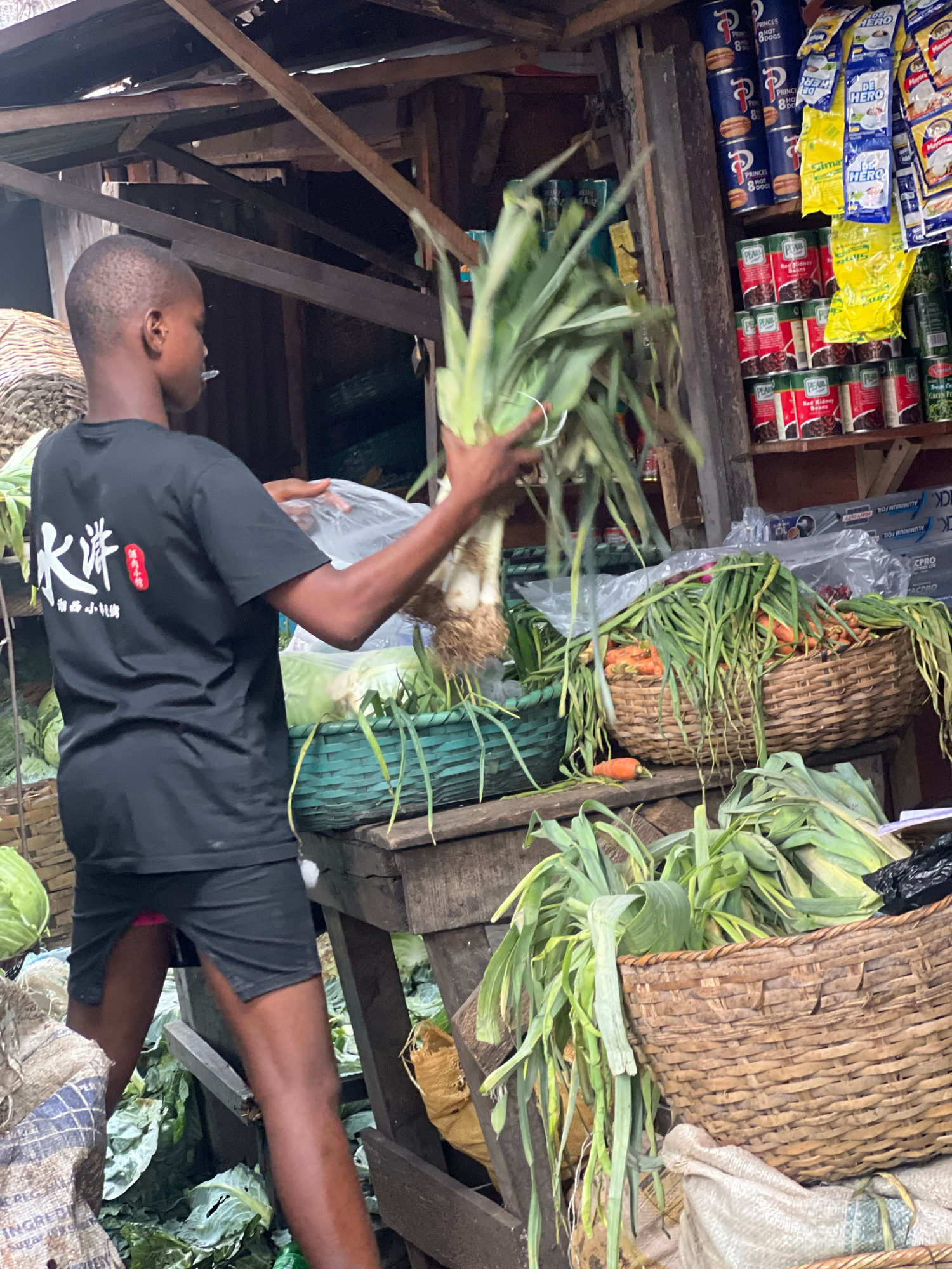 A street vendor in Nkpor, Nigeria, is seen holding a bundle of green leeks. The vendor, a young man with dark skin, is wearing a black t-shirt with white and red Asian script and black shorts. The ven…read more