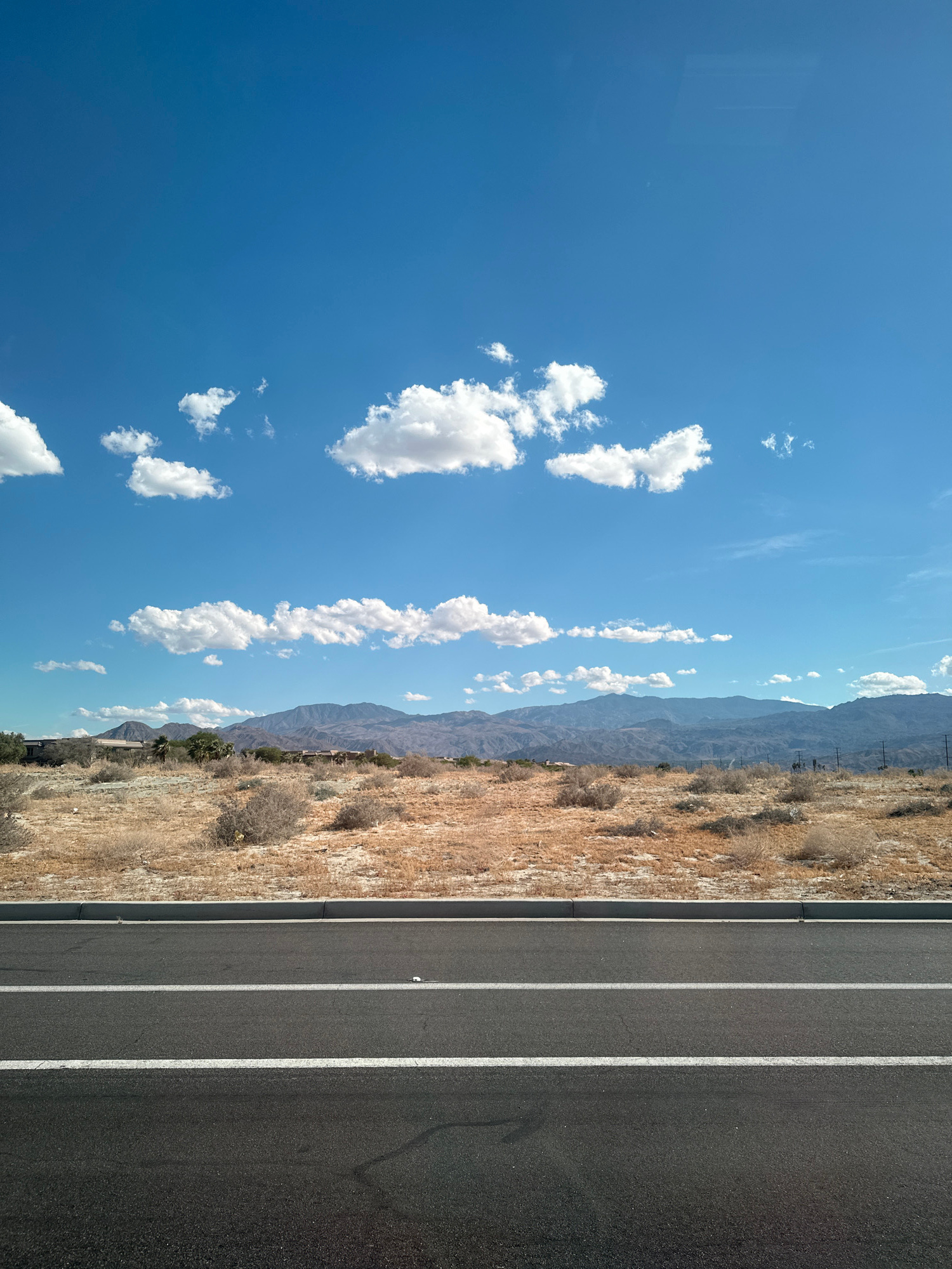 The image depicts a landscape in an arid environment. A clear blue sky with scattered cumulus clouds is visible above a mountain range in the distance. Adjacent to the dry, scrubby terrain is a paved…read more