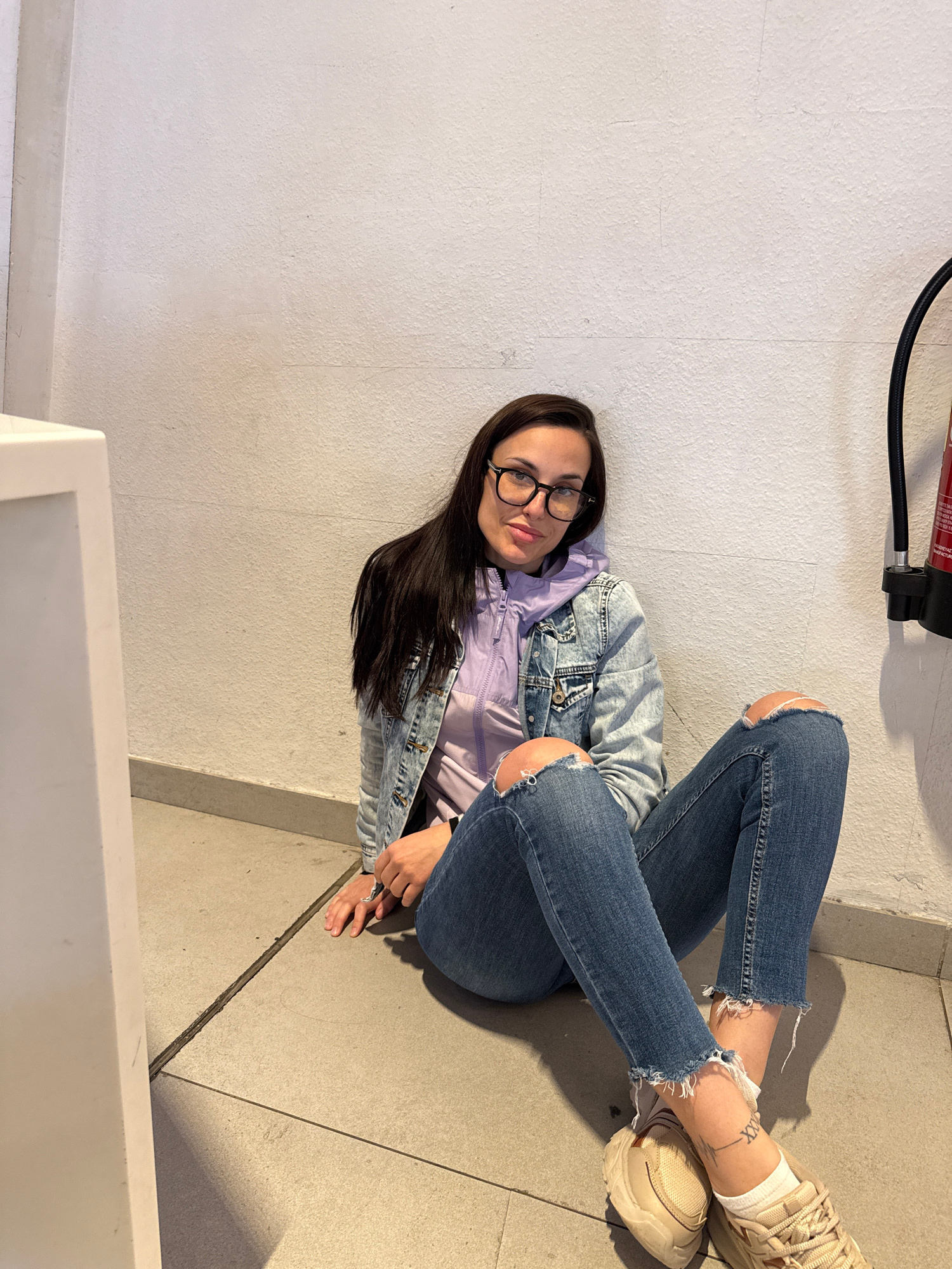 A young woman wearing ripped jeans, a light purple jacket, and a denim jacket sits on a gray tiled floor in an interior space. Her shoes are beige and she has a tattoo on her ankle. A white wall is to…read more