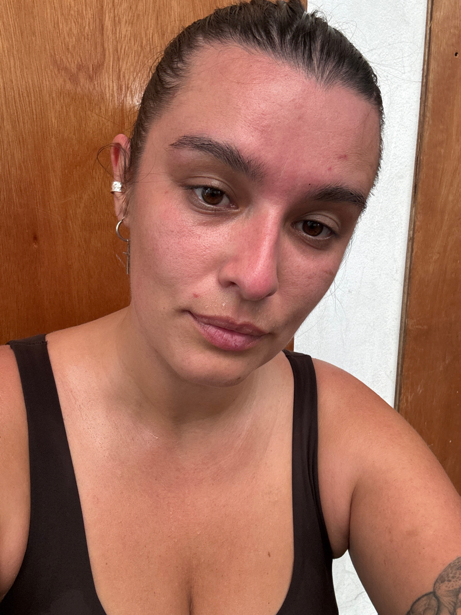 The image shows a woman with dark hair pulled back, brown eyes, and light skin. She is wearing a dark-colored top. The background consists of a light-colored wall and a wooden surface. The scene does…read more