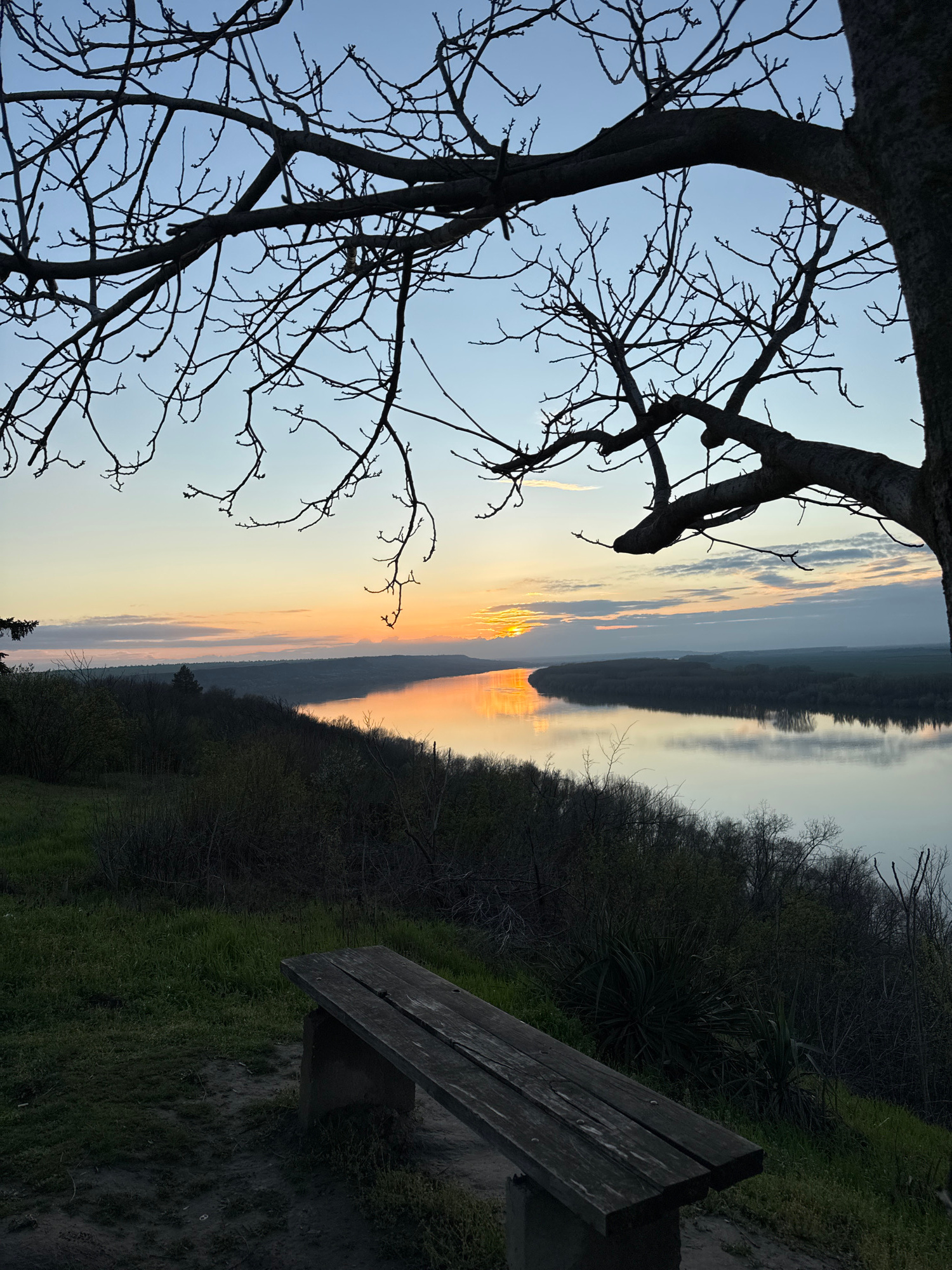 The image depicts a landscape at sunset, possibly near the city of Kozloduy, Bulgaria, based on similar scenery in that region. A bare tree branch is positioned in the foreground on the left side, sil…read more