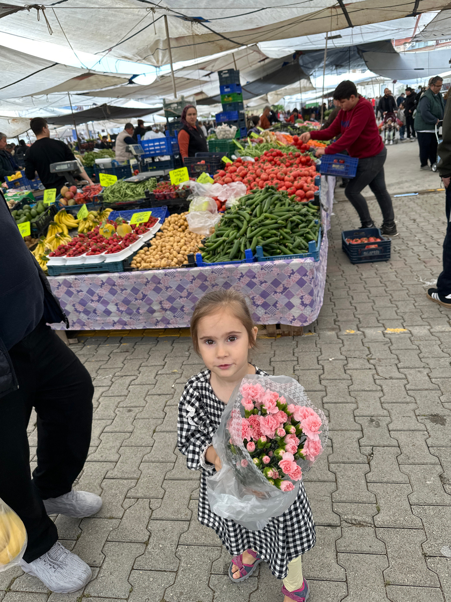 The image shows a young girl holding a bouquet of pink flowers at a market in Fethiye, Turkey. The market is bustling with vendors and customers, with stalls displaying various fruits, vegetables, and…read more