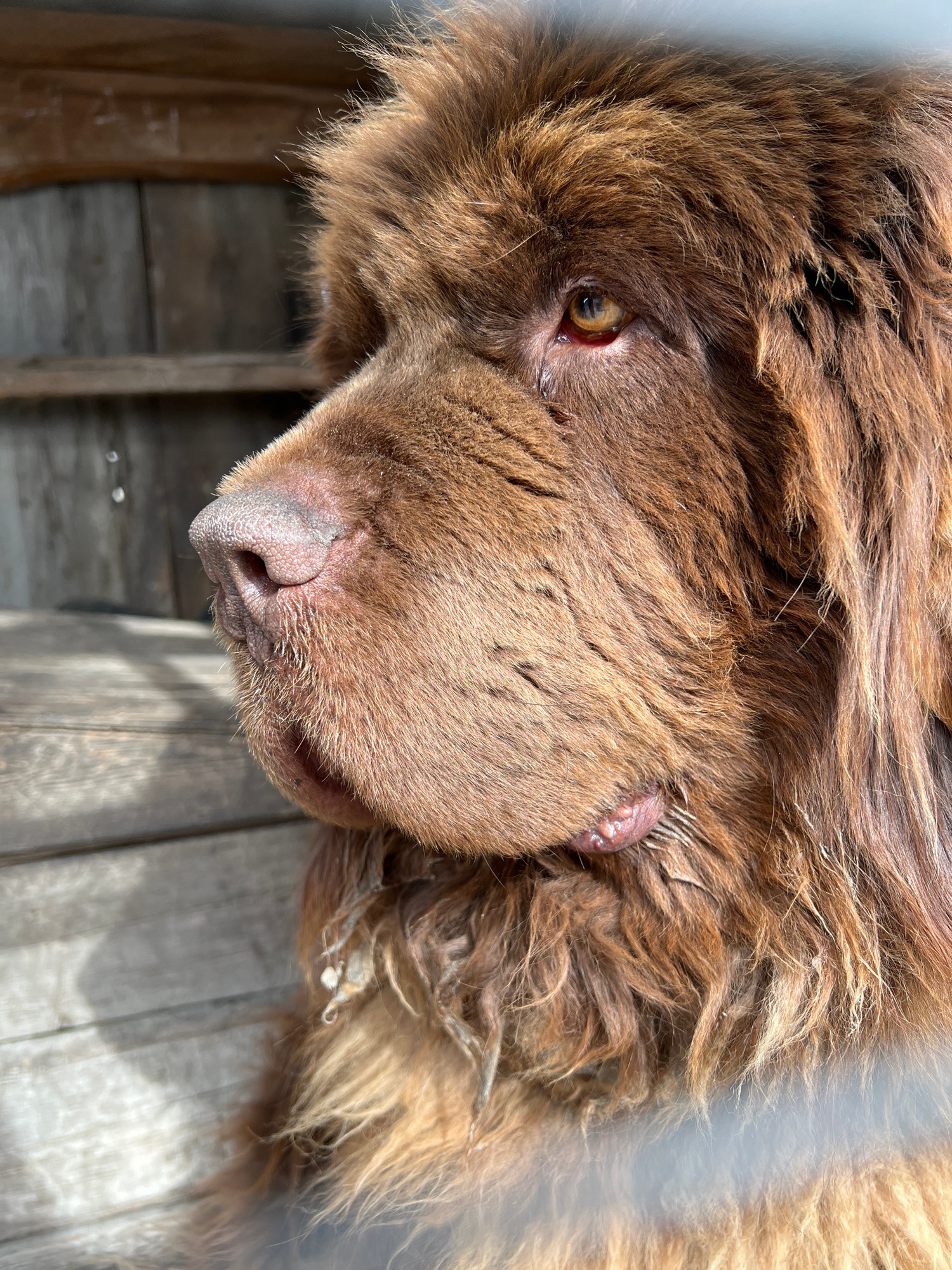A close-up view of a brown Newfoundland dog. The dog's head fills most of the frame, showing its eye, nose, and fur in detail. The background includes wooden planks, possibly part of a fence or buildi…read more